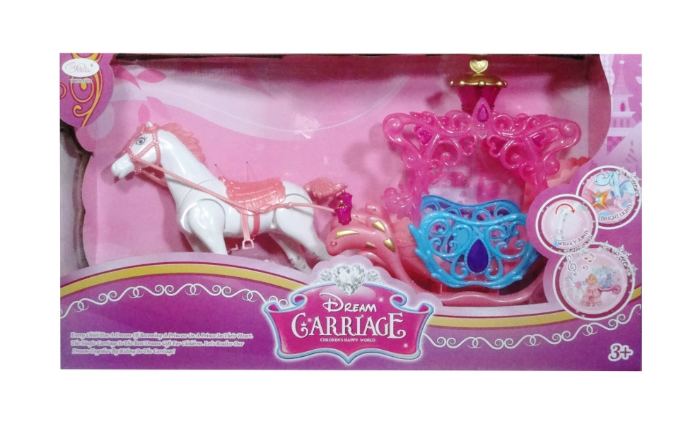 Deze elegante koets met paard is een ideale aanvulling voor alle kleine poppenliefhebbers. Kinderen zullen ervan houden om hun pop mee te nemen op reis naar een droomland, terwijl de koets straalt met kleurrijke lichtjes en een magische sfeer creëert.