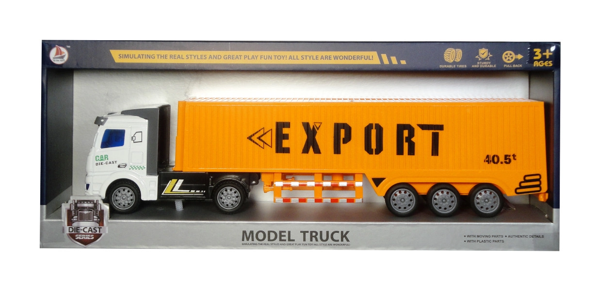 Leuke vrachtwagentrekker met container voor kleine bestuurders. De speelgoedtruck heeft metalen onderdelen voor extra duurzaamheid, een pull-back aandrijving voor snelle ritjes en is geschikt voor kinderen vanaf 3 jaar. Geleverd in kartonnen verpakking.