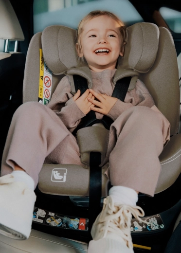 Met één beweging draai je het zitje naar de portierzijde, maak je het kind comfortabel vast en zet je het terug in de veilige stand met of tegen de rijrichting in.