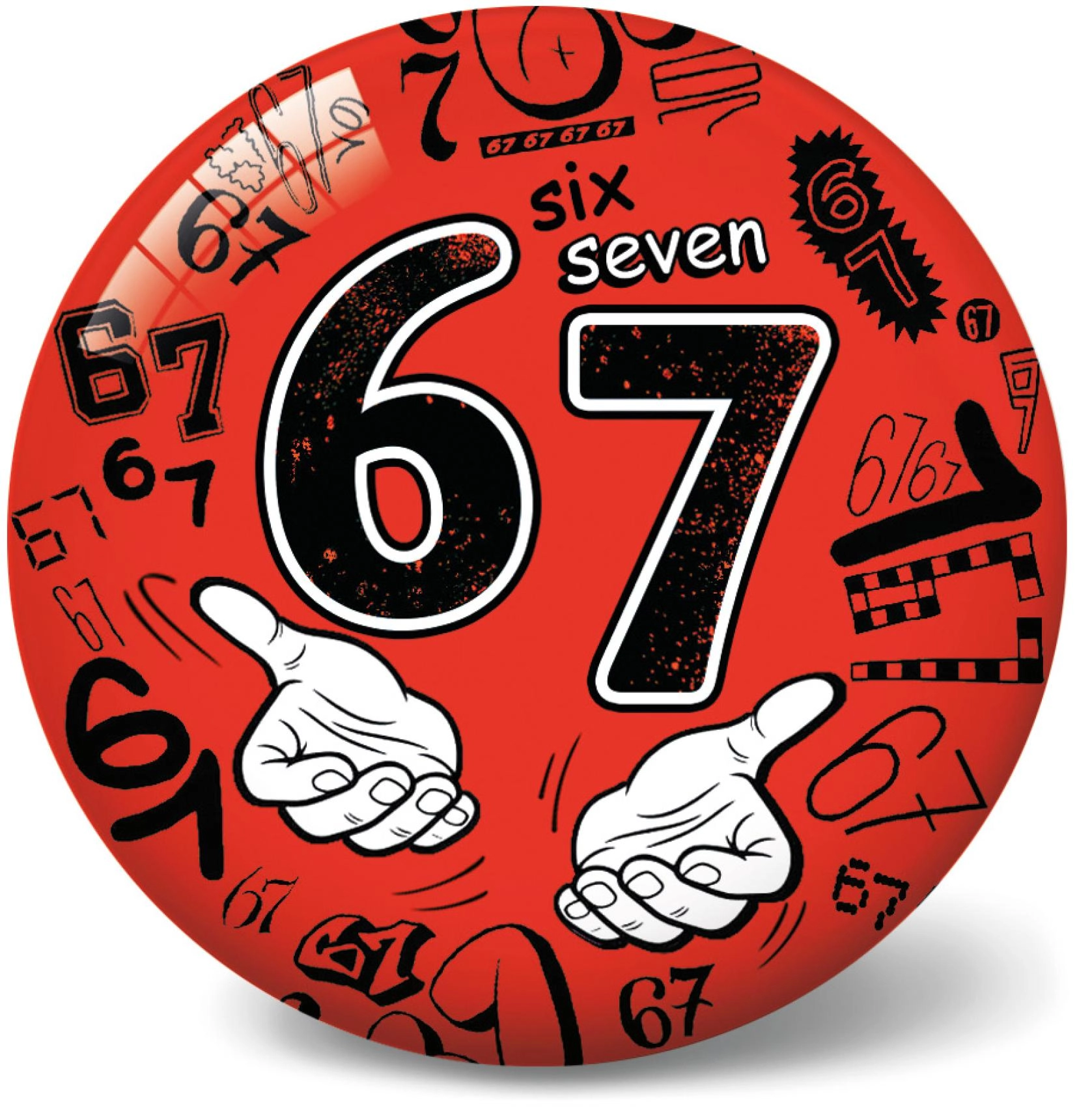 De opblaasbare Six Seven-bal in compact formaat van 11 cm is ideaal voor kinderen en volwassenen. Dankzij de lichte constructie is hij gemakkelijk te vangen en te gooien, terwijl de opvallende grafische motieven met het cijfer 67 en de woordvorm six/seven aanspreken en speels nummerinzicht ondersteunen.