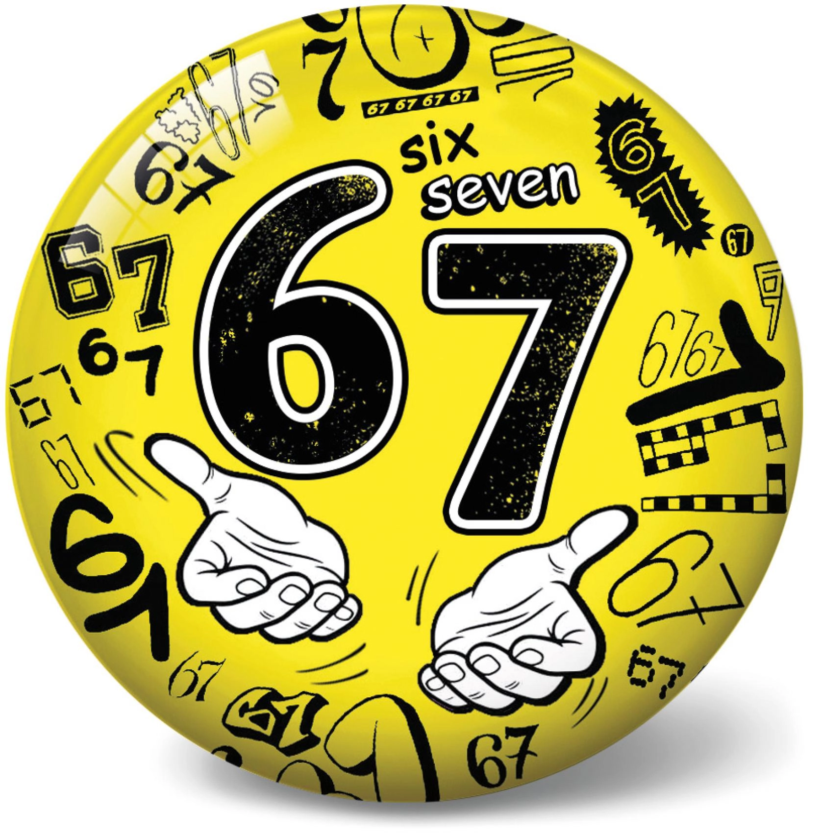 - Groot cijfer 67, woordweergave six/seven, handillustraties