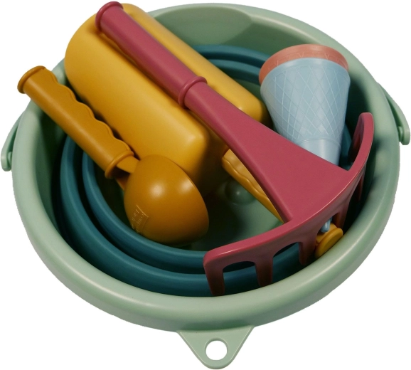 - Inhoud set (7 stuks): opvouwbare emmer 3 l, ijslepel, zeef, grote lepel, harkje, 2 zandvormpjes in de vorm van hoorntjes.