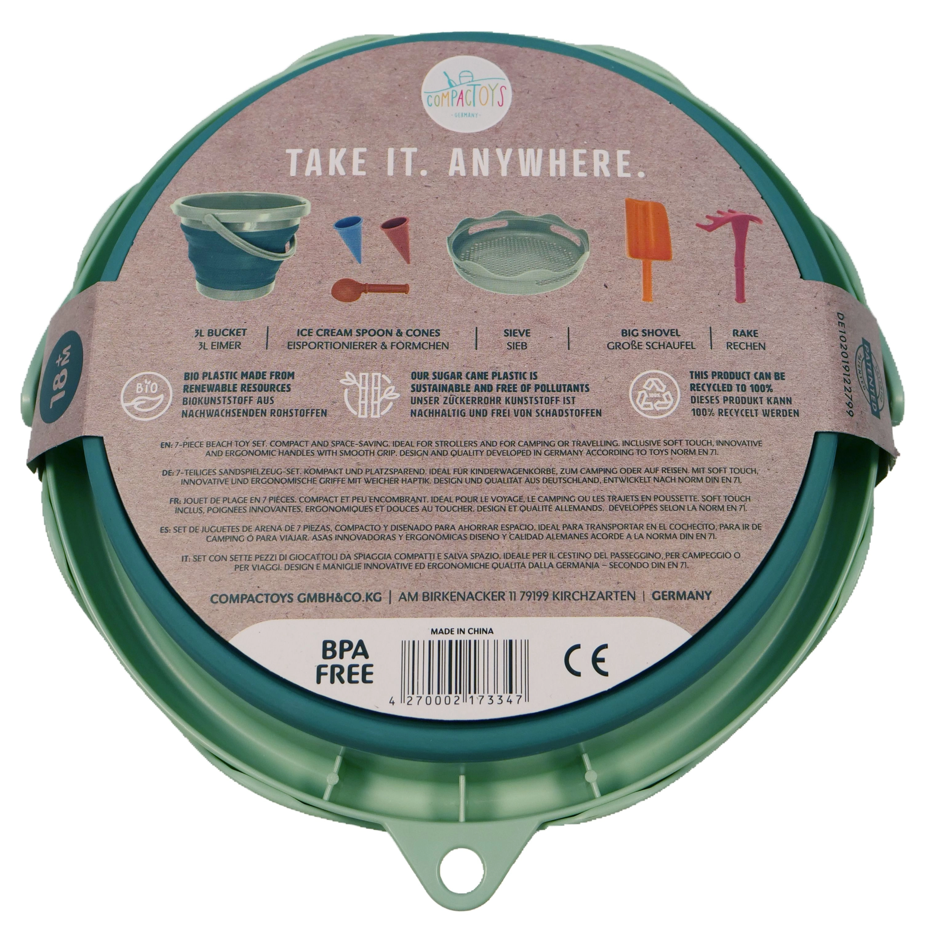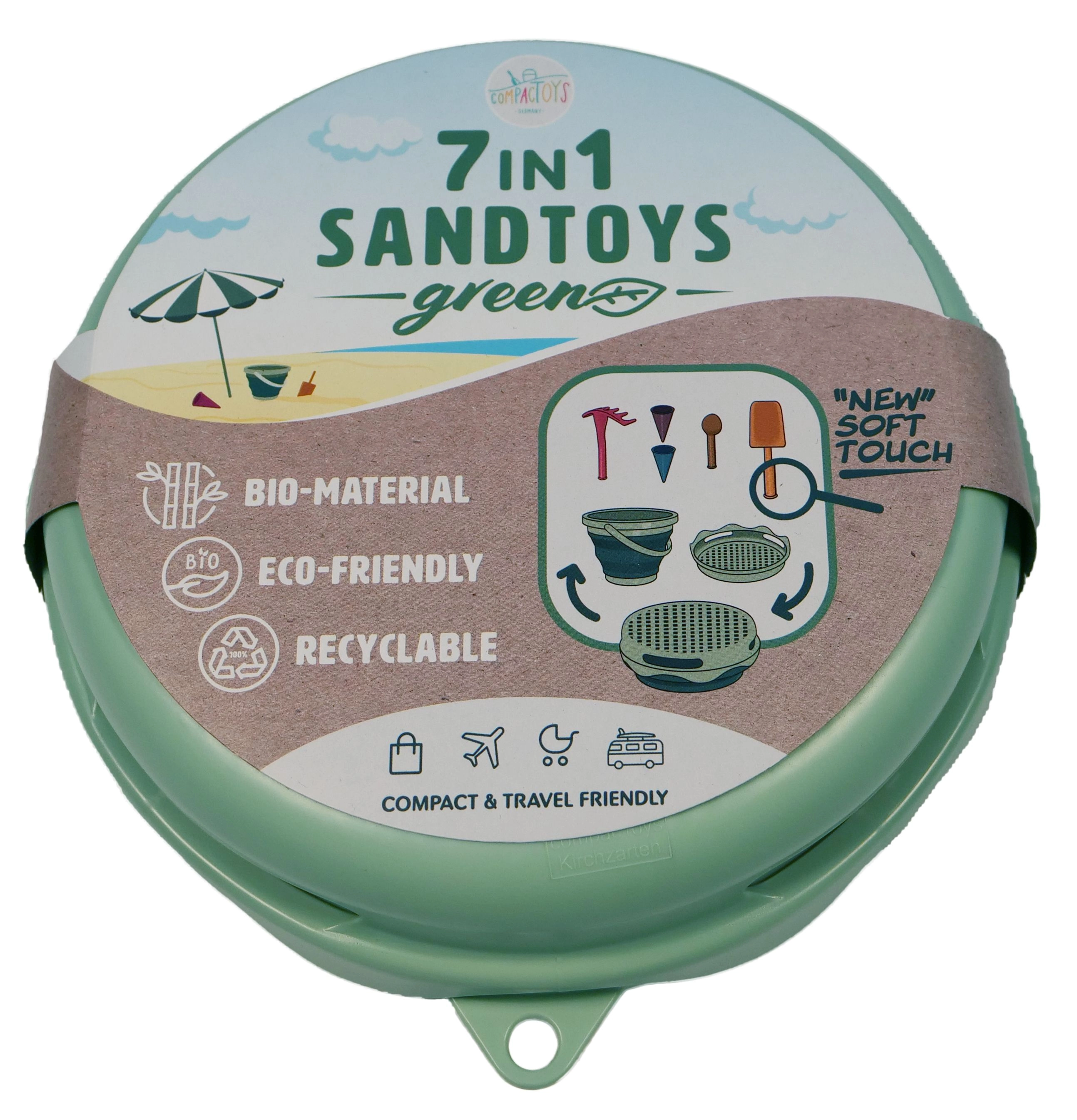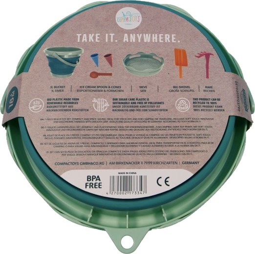 De materialen zijn biologisch onschadelijk en milieuvriendelijk, het gepatenteerde ontwerp zorgt voor duurzaamheid en een lange levensduur. De set is een geweldige metgezel voor op het strand, op de camping en in de zandbak – kortom overal waar kastelen worden gebouwd en zandtaartjes gemaakt.
