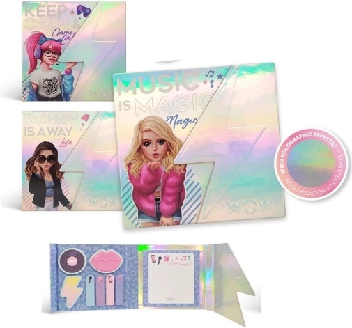 Stijlvol holografisch notitieblok met zelfklevende memoblaadjes en magnetische sluiting voor snelle notities thuis, op school en op kantoor. Bevat een notitieboekje en een set stickers in verschillende vormen, een modern en elegant design en drie personageprints ANNIE, EMMA en VALENTINA. Het model wordt willekeurig verzonden.