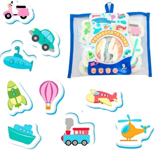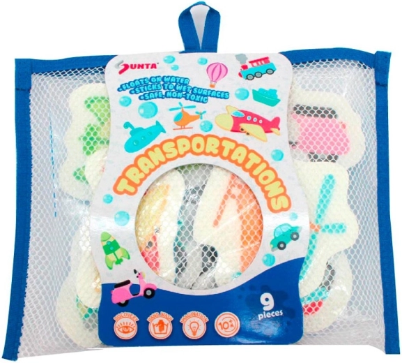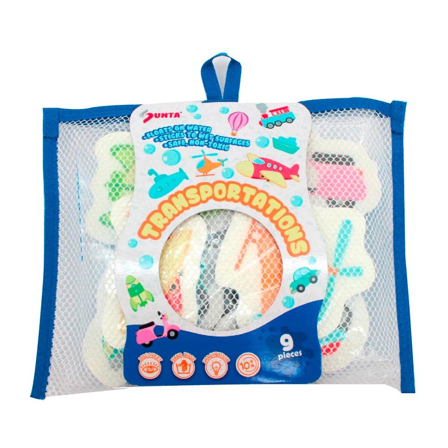 Een leuke badset met vervoersthema bevat 9 kleurrijke stukjes die na het natmaken aan het bad of de tegels blijven kleven. Stimuleert de verbeelding, vormherkenning en fijne motoriek. Het lichte en zachte foam is veilig voor kleine kinderhanden en perfect om mee te spelen in bad en bij het water.