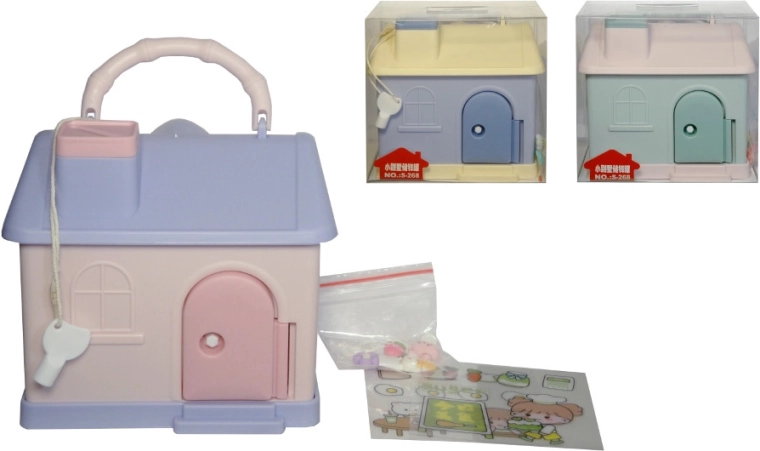 Een schattige spaarpot in de vorm van een huisje helpt kinderen hun eerste spaargeld te bewaren en een spaargewoonte aan te leren. Hij heeft vergrendeling met sleuteltje voor de veiligheid van munten, een decoratieve handgreep voor eenvoudig dragen en wordt geleverd in vrolijke kleuren die willekeurig worden gekozen. Geschikt voor kinderen vanaf 3 jaar.