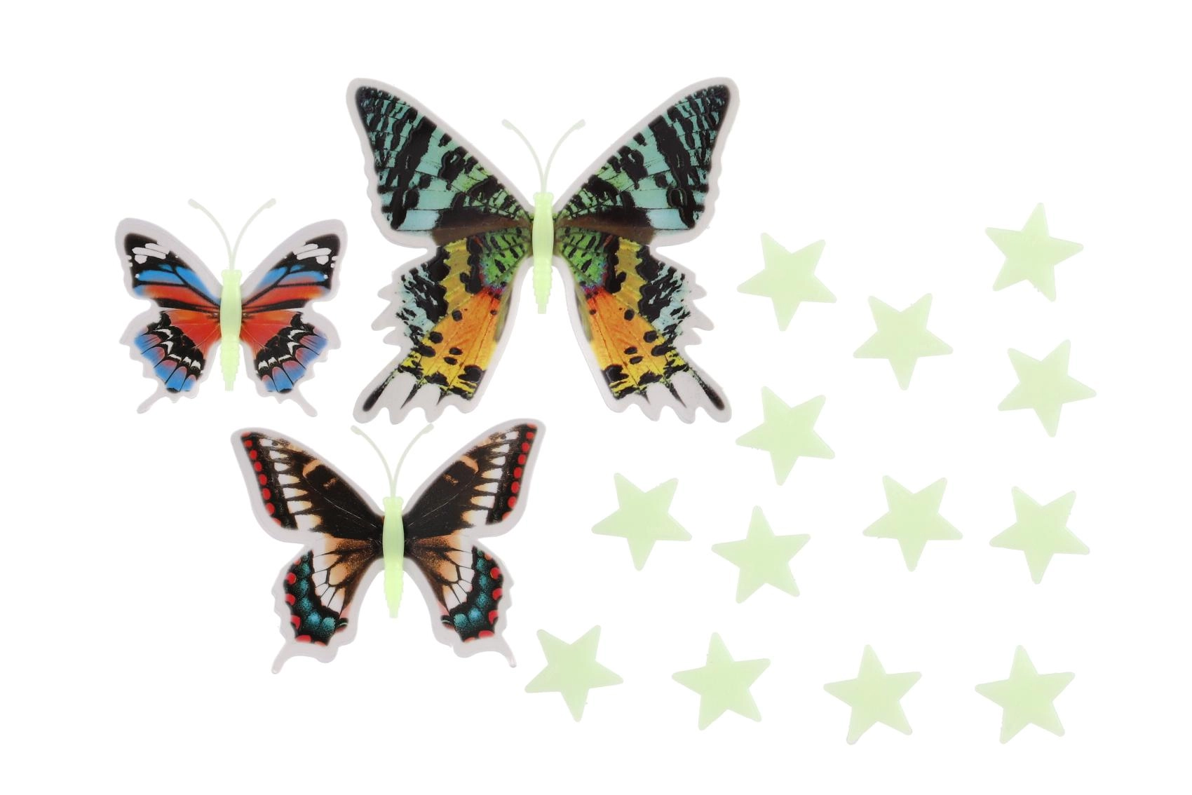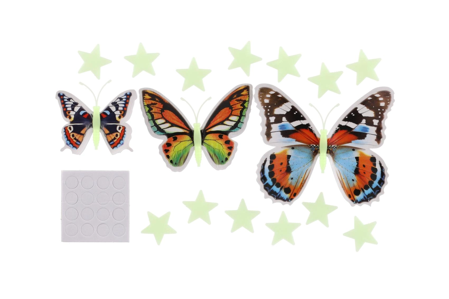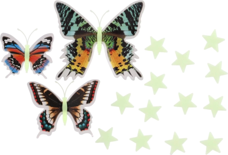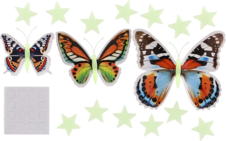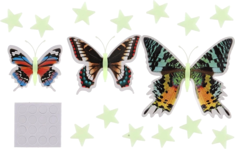 Een betoverende set kleurrijke vlinders en sterretjes die in het donker oplichten en een fijne sfeer voor het inslapen creëren. Eenvoudige installatie met zelfklevende puntjes, 3D-effect van vlindervleugels en lichtgevende sterren toveren elke muur om tot een creatieve fantasiewereld.