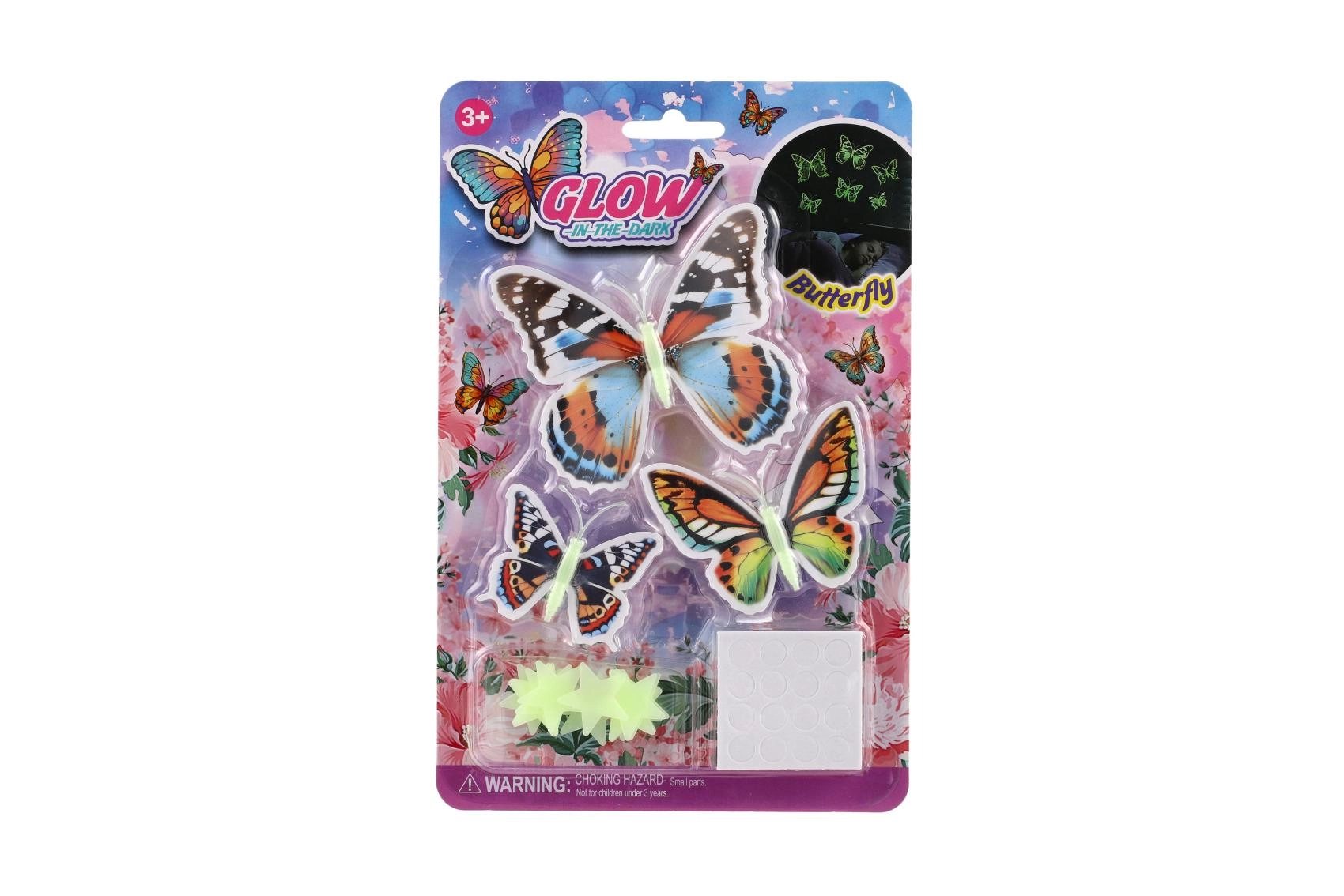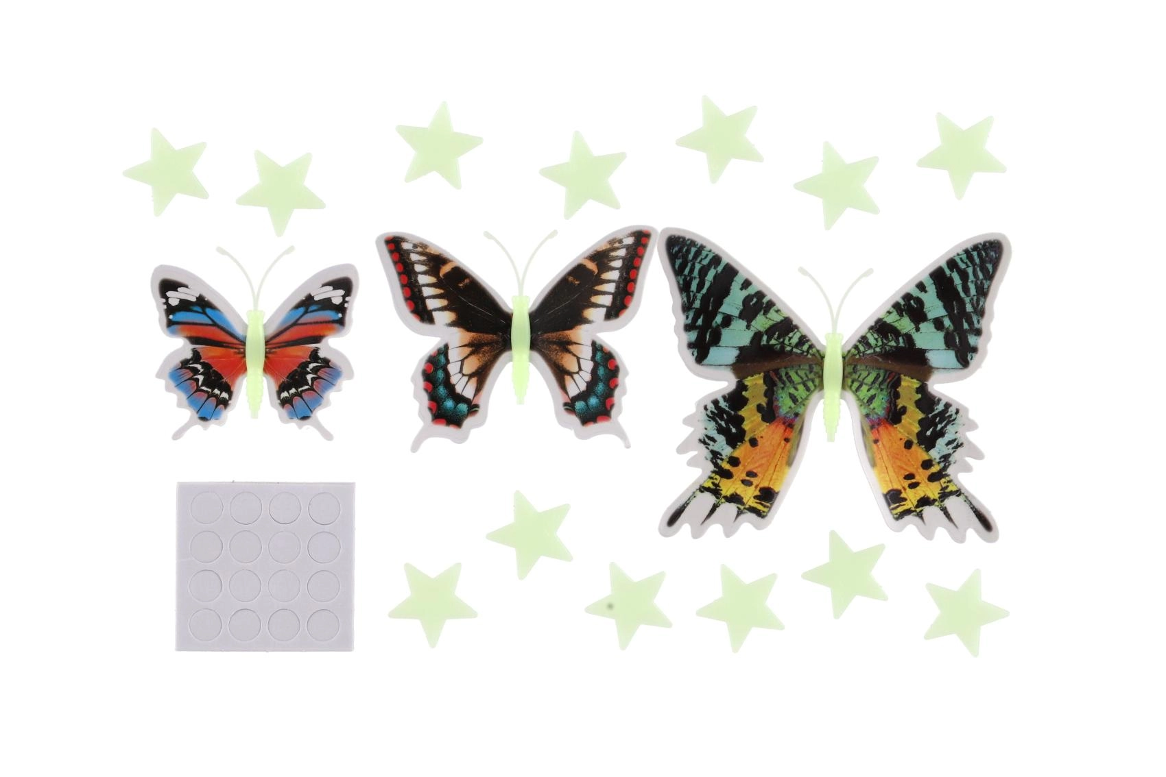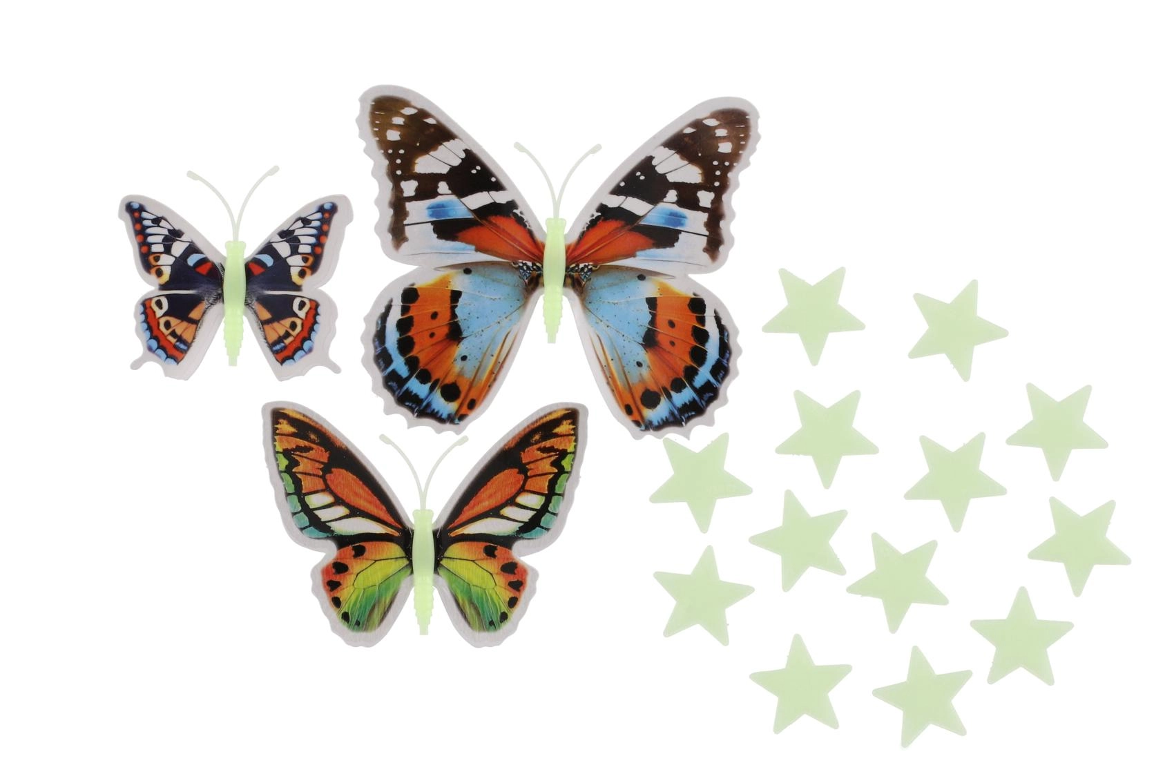 Een betoverende set kleurrijke vlinders en sterretjes die in het donker oplichten en een fijne sfeer voor het inslapen creëren. Eenvoudige installatie met zelfklevende puntjes, 3D-effect van vlindervleugels en lichtgevende sterren toveren elke muur om tot een creatieve fantasiewereld.
