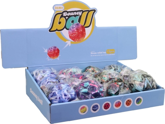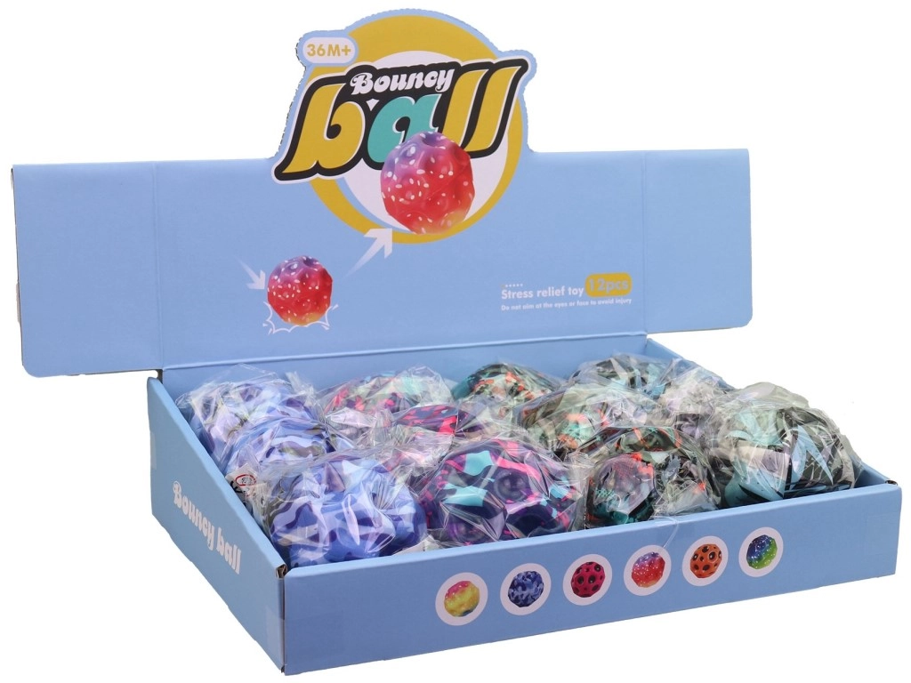 Universele elastische balletjes met een diameter van 8 cm voor speelplezier binnen en buiten. Dankzij het flexibele materiaal stuiteren ze uitstekend, stimuleren ze beweging en coördinatie en zijn ze ideaal voor allerlei bewegingsspelletjes. De verpakking met 12 stuks in een praktische displaybox is ideaal voor verkoop, kinderdagverblijven en als kleine cadeautjes. Geschikt voor kinderen vanaf 3 jaar.