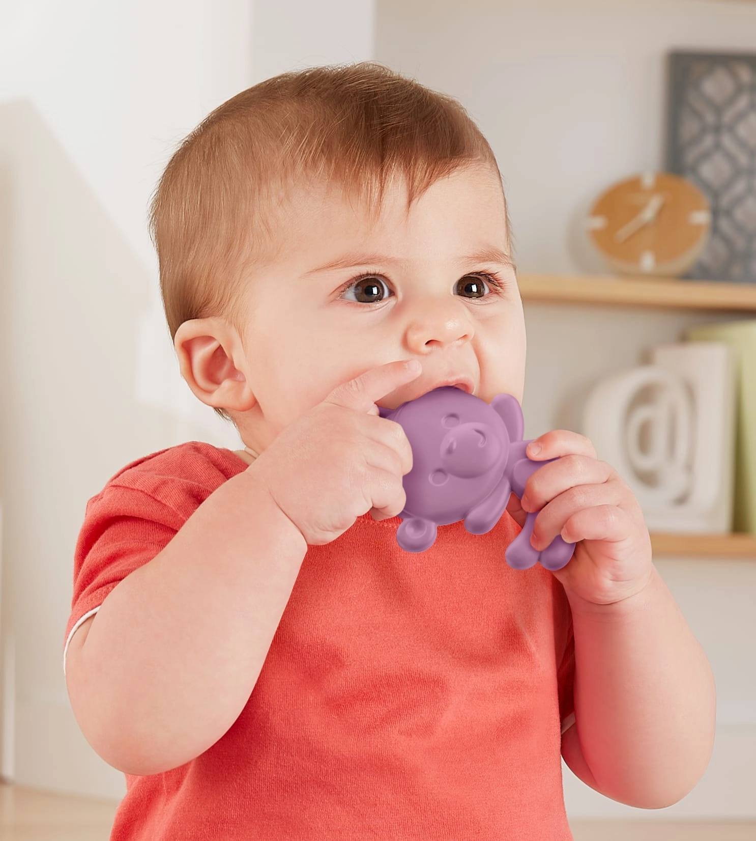 Door de ergonomische vorm past hij perfect in kleine kinderhandjes. Kinderen kunnen de bijtring gemakkelijk vastpakken, knijpen en verkennen – allemaal veilig, want het product bevat geen BPA.