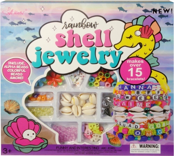 Set met kleurrijke kralen in diverse maten en vormen voor het creatief maken van originele armbanden. Inclusief een koordje om te rijgen. Verschillende vormen (schelpjes, bloemetjes, letters), eenvoudig rijgen en plezier voor kinderen vanaf 3 jaar.