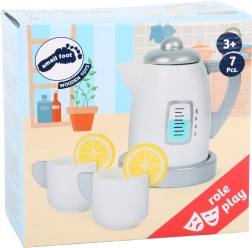 De set bevat een theepot met deksel en onderzetter, twee kopjes en schijfjes citroen, zodat kinderen echte theefeestjes kunnen naspelen. Het product is gemaakt van een combinatie van massief hout en sterk multiplex, waardoor stevigheid en duurzaamheid zijn gegarandeerd.