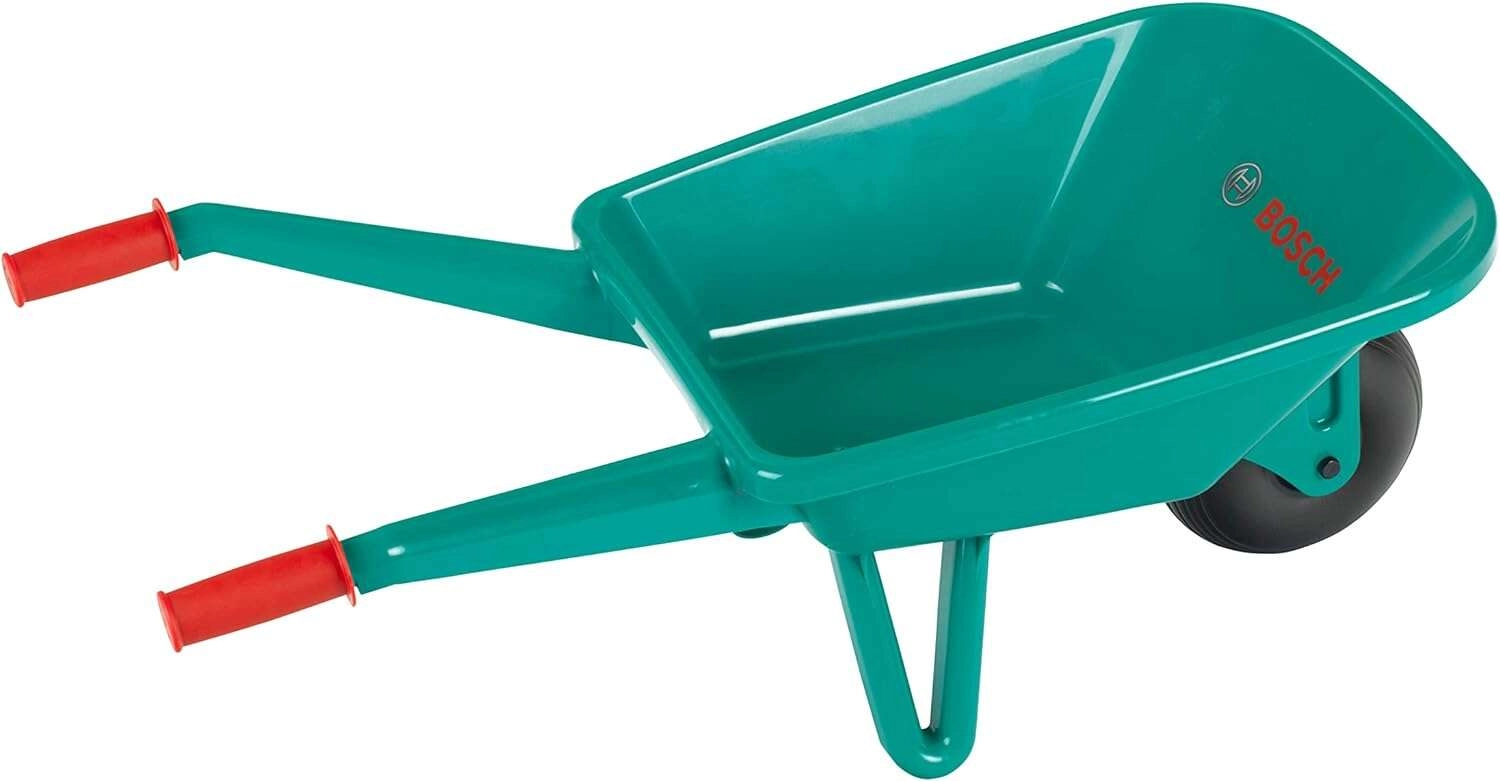 De lichte BOSCH mini kinderkruiwagen van het merk Klein is een getrouwe kopie van echt gereedschap. Hij heeft een stevige kunststof bak, ergonomische rode handgrepen en stabiele steunpootjes voor veilig neerzetten. Ideaal om tuinieren na te spelen, speelgoed, zand of bladeren te vervoeren en de motoriek te ontwikkelen bij kinderen vanaf 3 jaar.