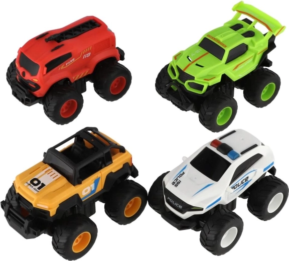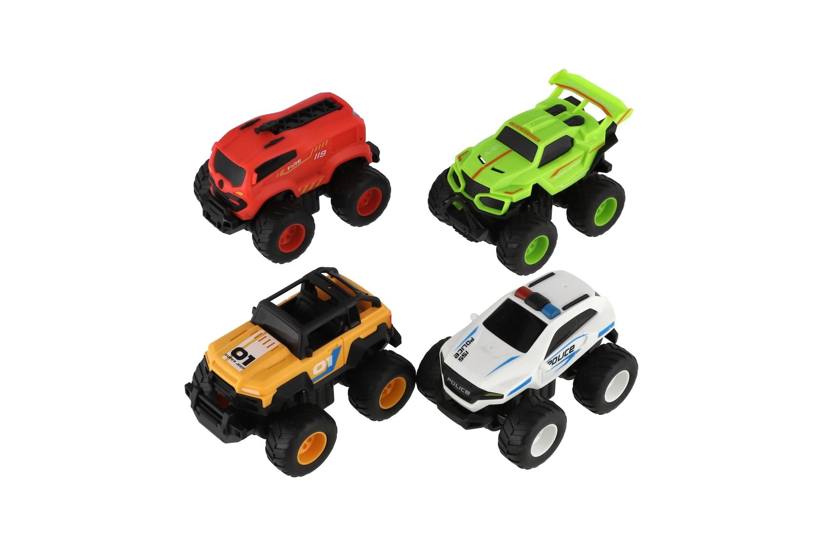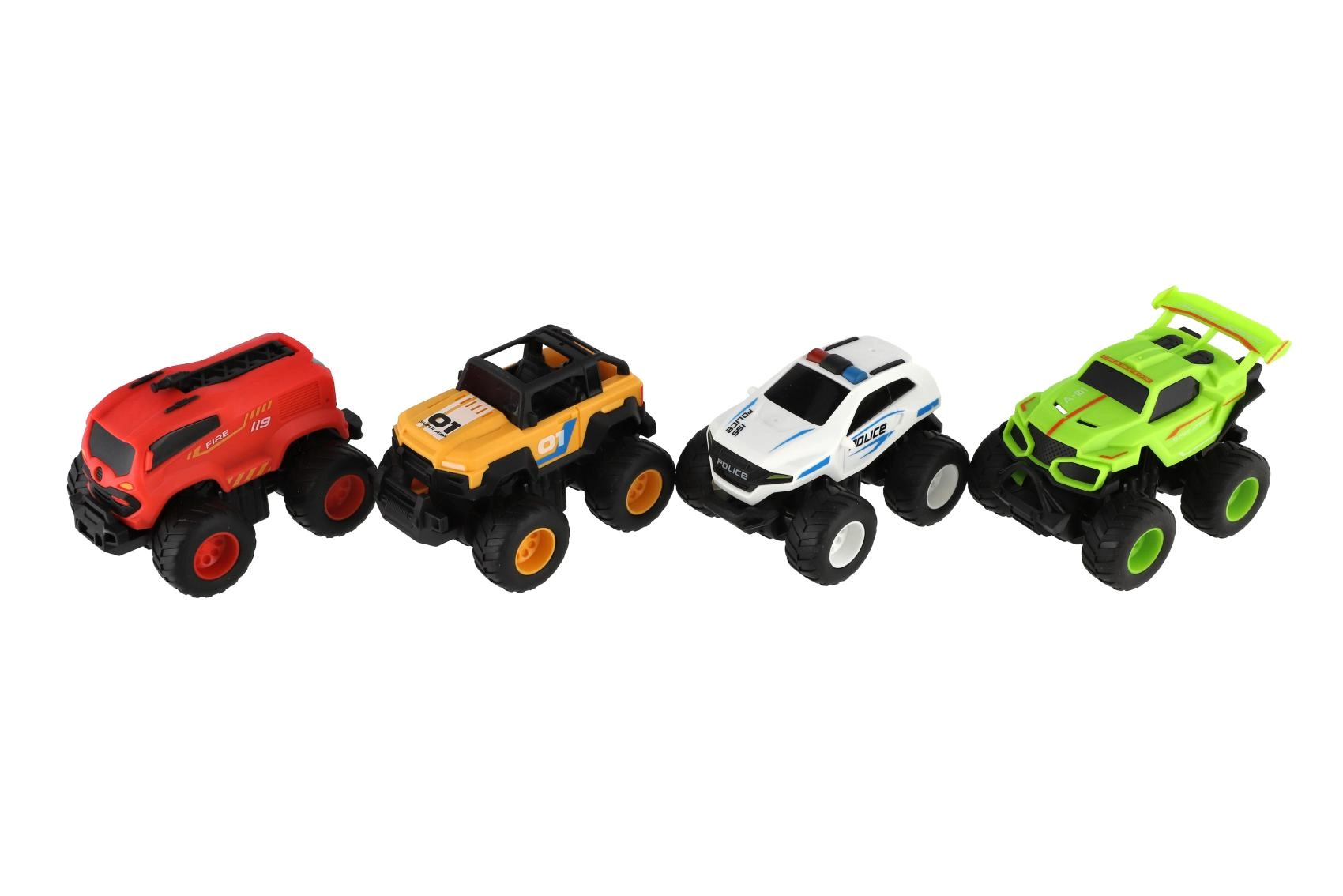 In de set vind je race-, politie- en brandweeruitvoeringen plus een sportieve monstertruck – perfect voor rollenspellen en om te verzamelen.