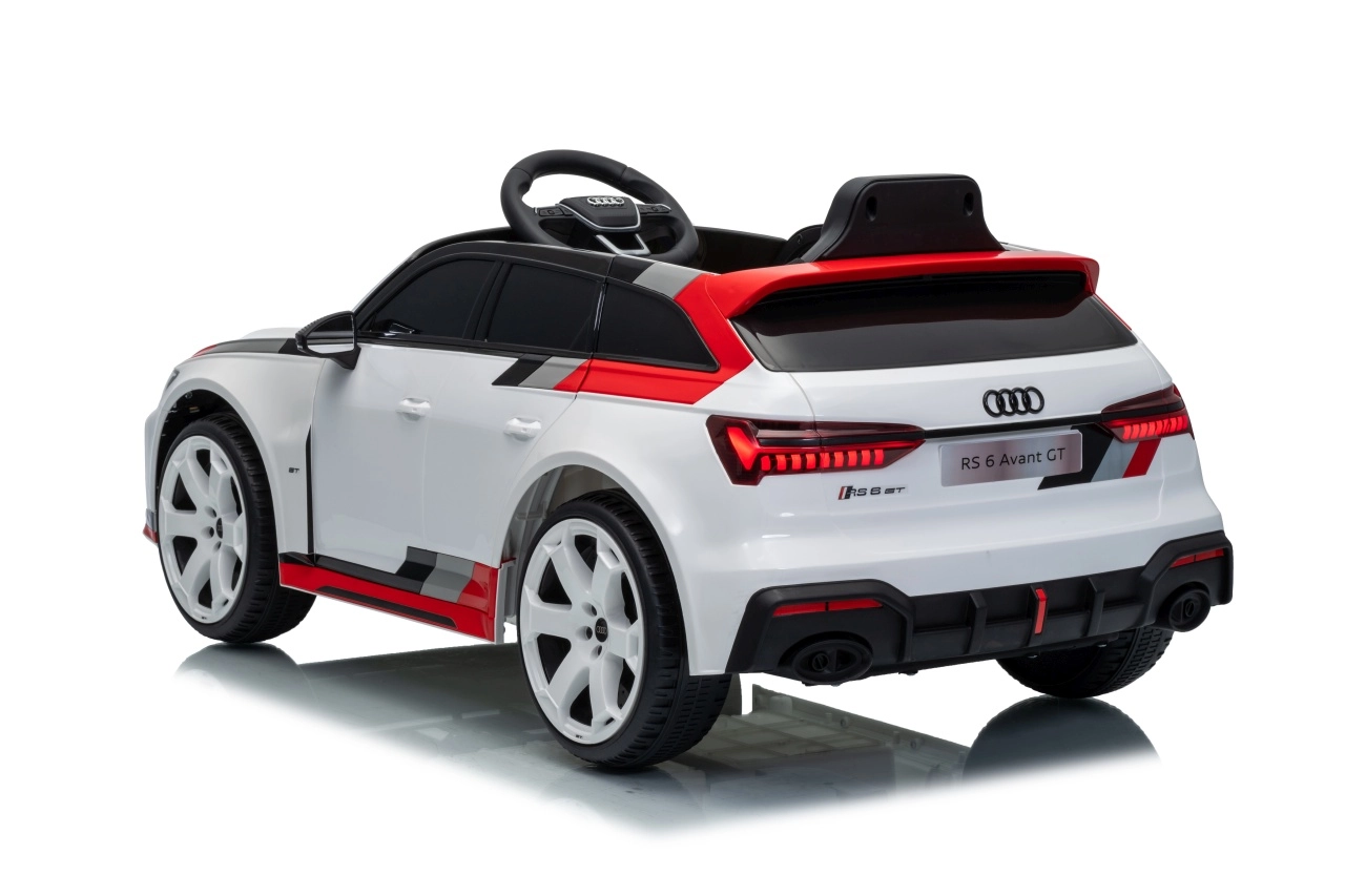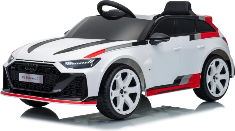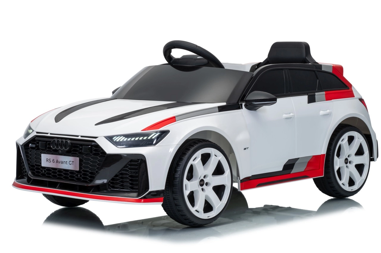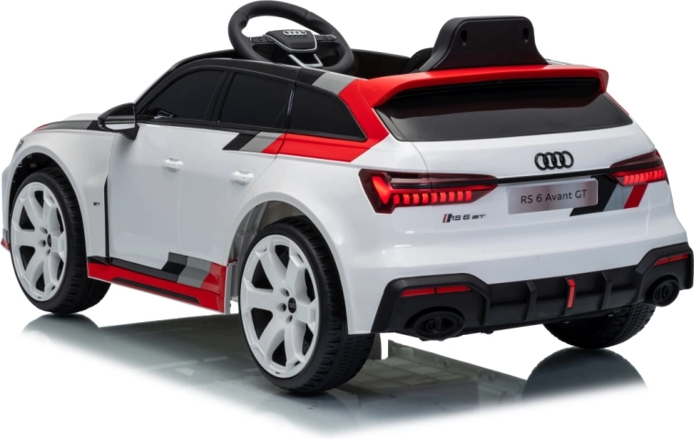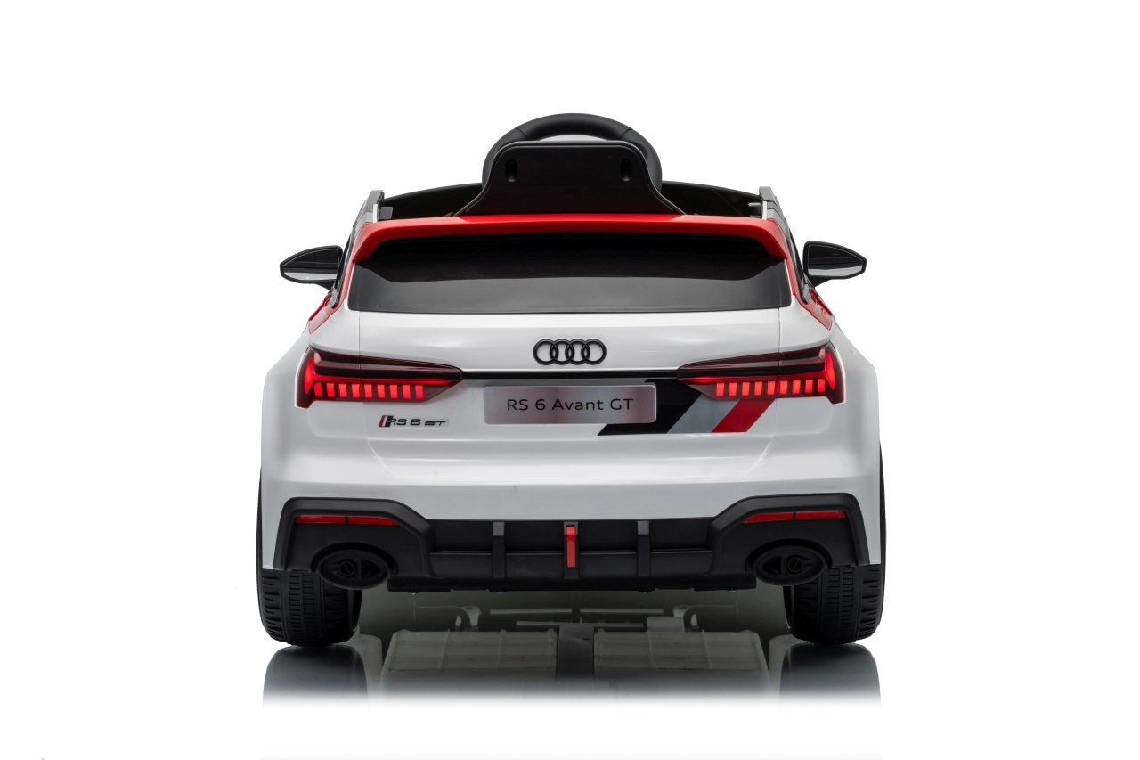 Stijlvolle kinder elektrische auto AUDI RS 6 AVANT GT in het wit met krachtige 4×35 W motoren, 12 V 9 Ah accu, 2,4 GHz afstandsbediening met noodstopfunctie, zachte EVA-banden, lederen stoel met gordel en LED-verlichting voor en achter. De realistische look, zachte start en uitgebreid audiopaneel met Bluetooth, MP3, USB en AUX zorgen voor een veilige en leuke rit voor kinderen.