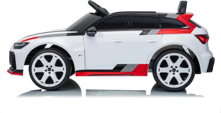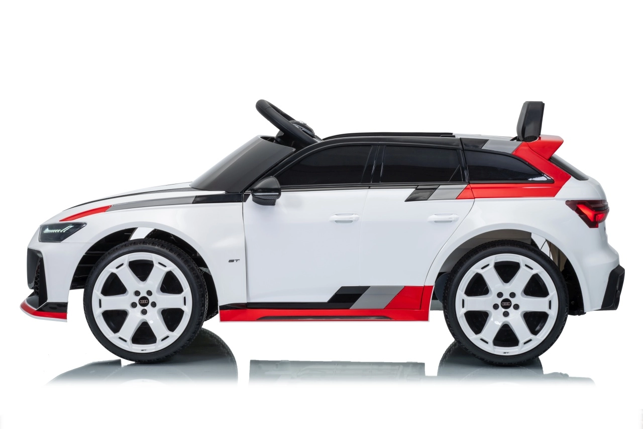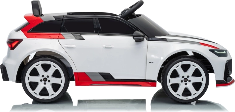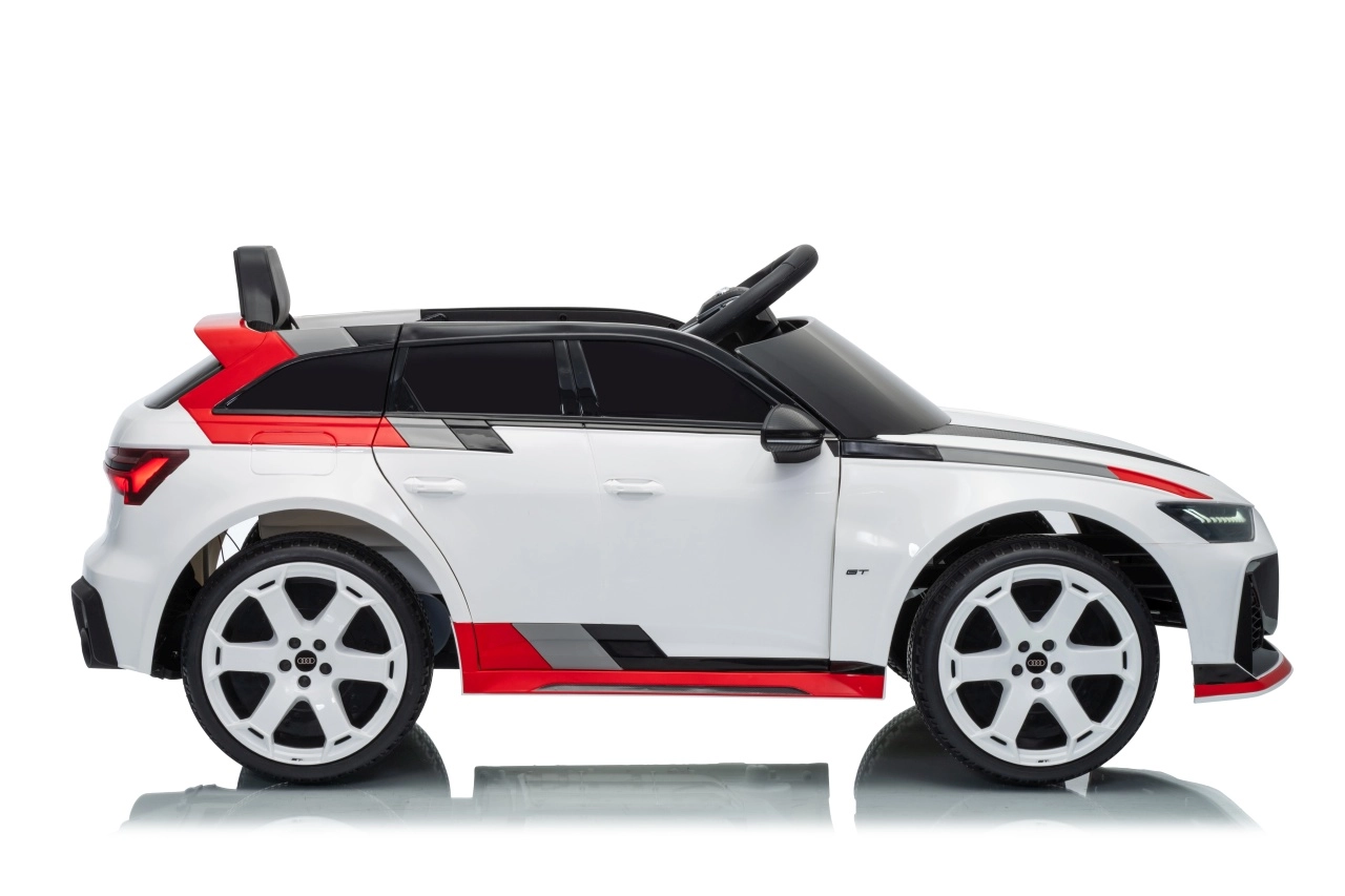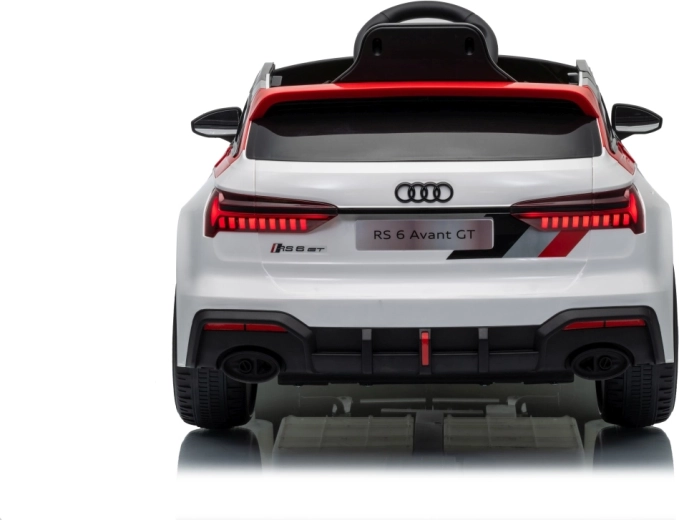 Stijlvolle kinder elektrische auto AUDI RS 6 AVANT GT in het wit met krachtige 4×35 W motoren, 12 V 9 Ah accu, 2,4 GHz afstandsbediening met noodstopfunctie, zachte EVA-banden, lederen stoel met gordel en LED-verlichting voor en achter. De realistische look, zachte start en uitgebreid audiopaneel met Bluetooth, MP3, USB en AUX zorgen voor een veilige en leuke rit voor kinderen.