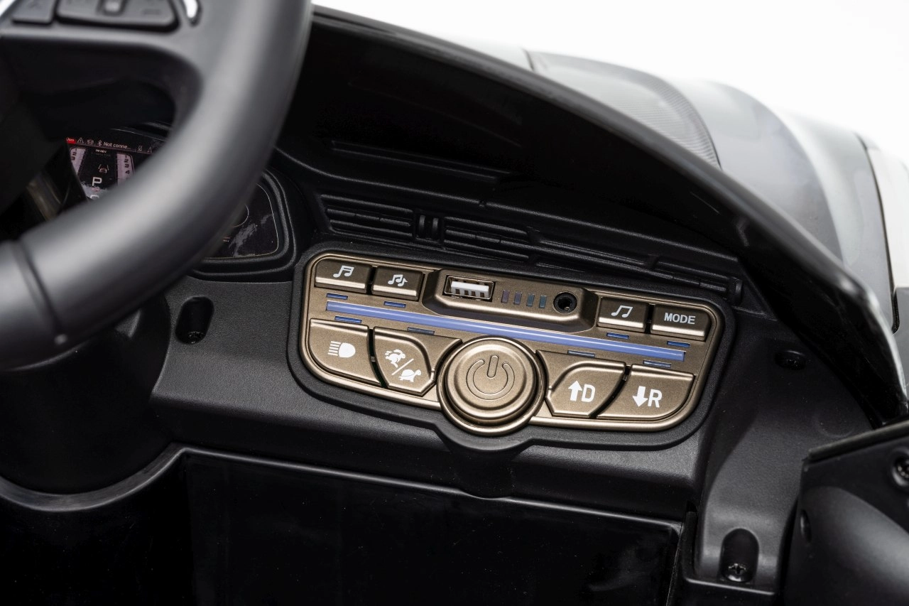 Veiligheid en controle worden verzorgd door de 2,4 GHz ouderafstandsbediening met drie snelheden en Emergency Stop. Kinderen zullen genieten van de openende deuren, LED-lichten voor en achter en het overzichtelijke dashboard. Het multimediapaneel laat muziek afspelen via Bluetooth, USB, MP3 of AUX, en er zijn geluiden en een claxon op het stuur.
