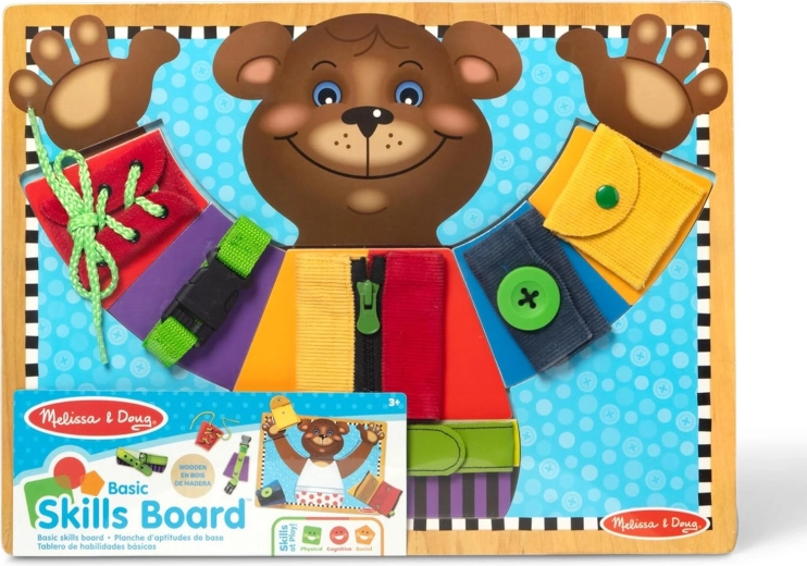 Kleurvol houten manipulatietablet met een beertje van Melissa & Doug ontwikkelt de fijne motoriek, oog-handcoördinatie en zelfstandigheid bij het aankleden. Kinderen oefenen veilig met ritsen, gespen, knoop, drukknop/kliksysteem en veterstrikken op zes afneembare textiele onderdelen met een stevige houten basis.