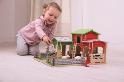 De set is gemaakt van hoogwaardig hout uit verantwoorde bronnen en is compatibel met extra accessoires die je later kunt bijkopen. Realistische elementen zoals de eendenpoel, tractorgarage en weides met beweegbare poorten stimuleren fantasierijk spel, verhalen verzinnen en de ontwikkeling van de fijne motoriek.