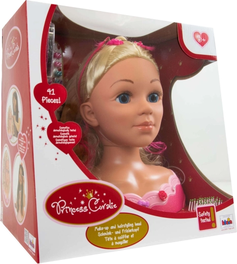 De PRINCESS CORALIE stylingskop maakt alle kleine stylisten blij. Realistisch, lang en gemakkelijk doorkambaar haar, blauwe ogen en een stabiele roze voet zorgen voor comfortabel en leuk creëren van kapsels en make-up. De uitgebreide set met borstel, kam, speldjes, kralen en een kindvriendelijk make-uppalet geeft alle ruimte aan de fantasie.