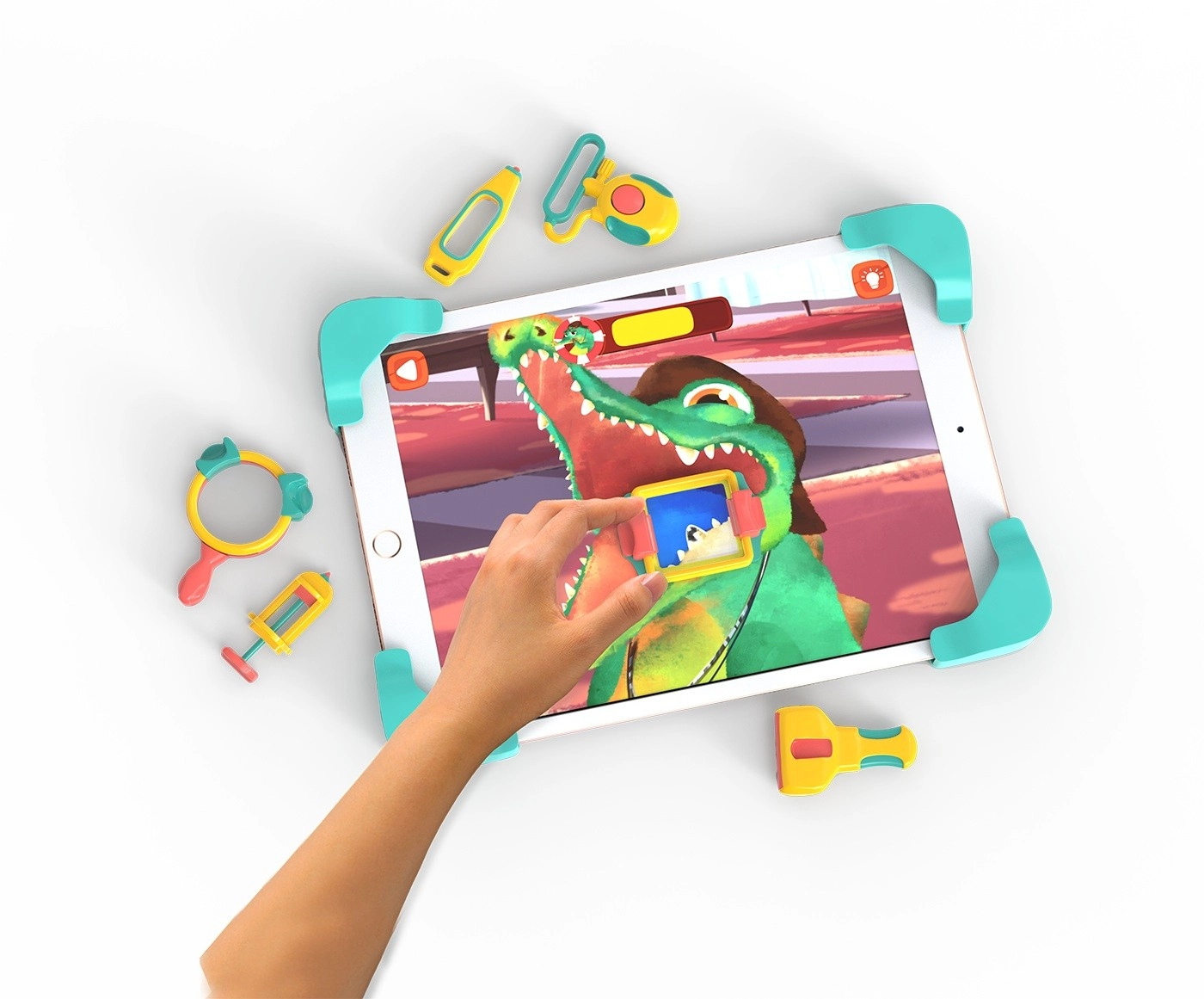 Kleurige kunststof instrumenten werken samen met de app en veranderen de tablet in een kinderpraktijk. Kinderen plaatsen de onderdelen op het scherm en voeren stap voor stap taken uit.