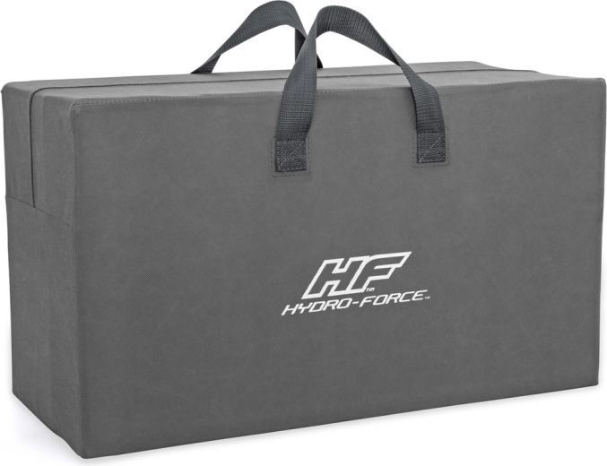 In de verpakking ontvang je een kajak voor 2 personen, twee dubbele peddels, een Air Hammer handpomp, een afneembare vin/skeg, een reparatiepatch en een transporttas – je kunt meteen vertrekken.
