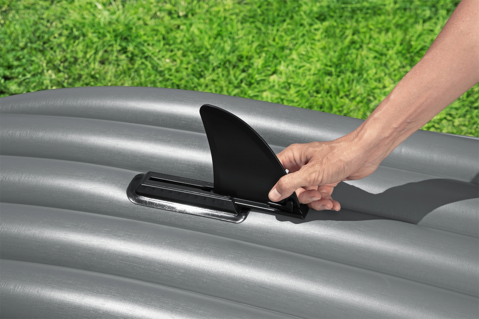 Praktische features zoals voor- en achterste bungee‑netten voor opslag, een rondom lopend grijptouw voor eenvoudige handling en snelsluitventielen voor snel op‑ en aflaten besparen tijd en ruimte. De afneembare vin (skeg) in verschillende maten helpt een rechte koers aan te houden en verbetert de wendbaarheid.
