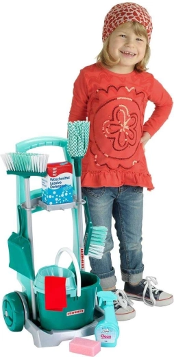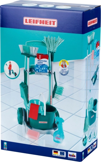 De kinder schoonmaakset met officiële LEIFHEIT-licentie lijkt op echt materiaal, maar is veilig aangepast voor kleine helpers. De robuuste wagen met wielen heeft houders voor gereedschap, een plank voor de emmer en plek voor een doosje met “detergent”, zodat kinderen zich voelen alsof ze echt schoonmaken.