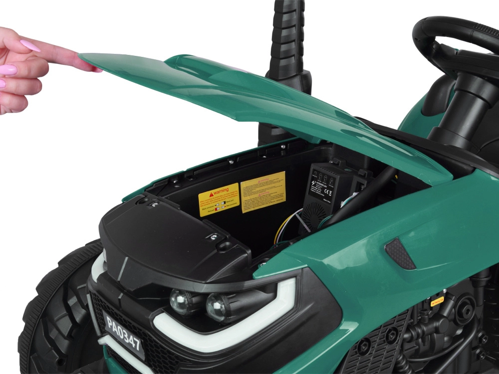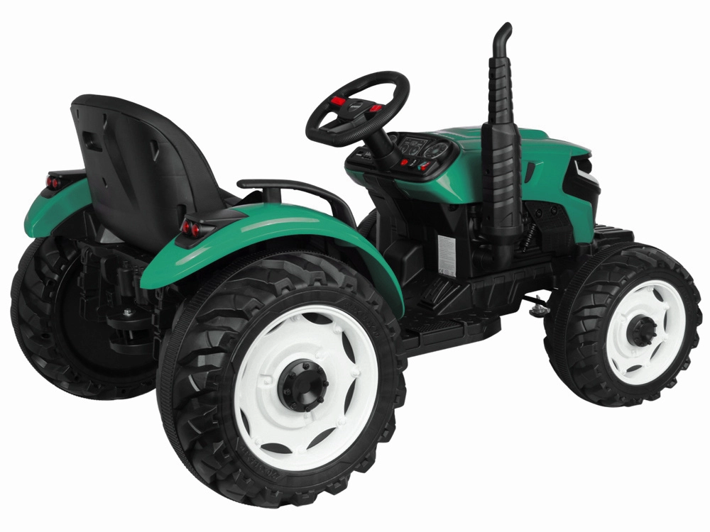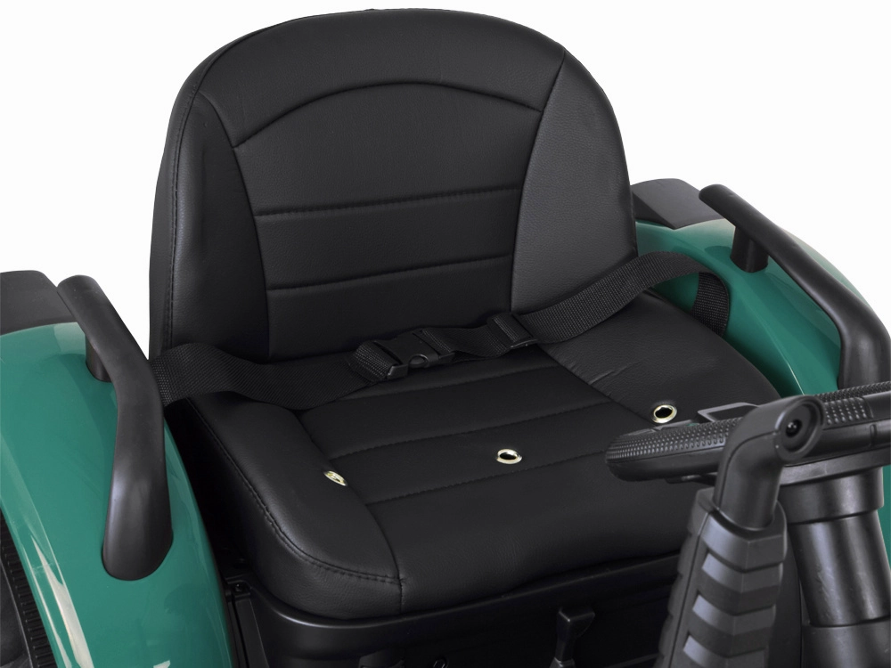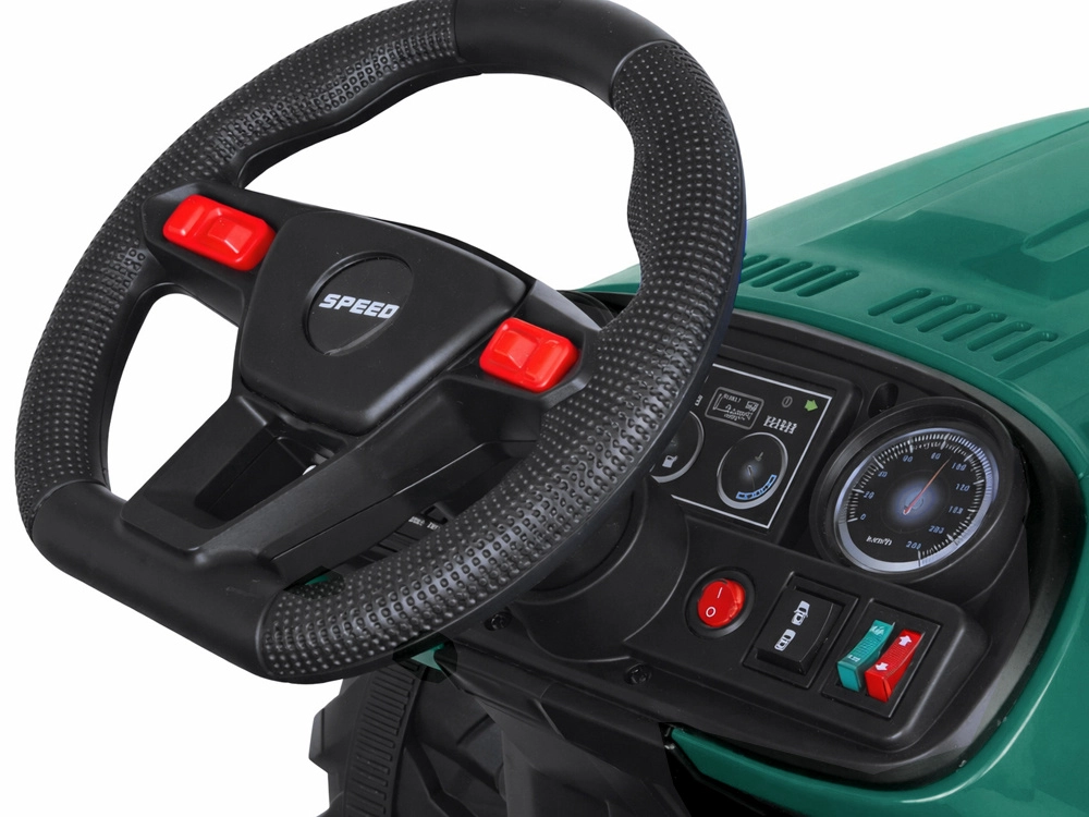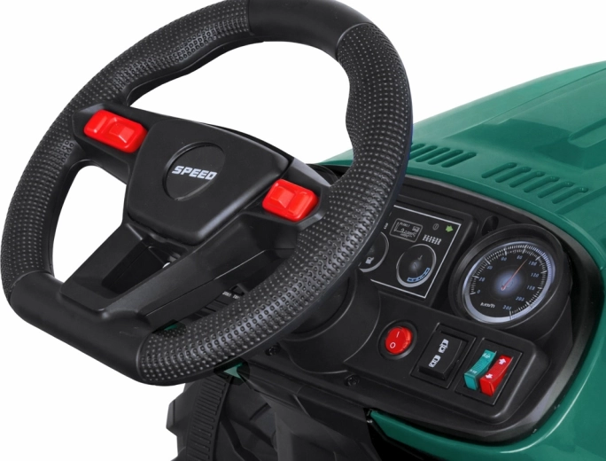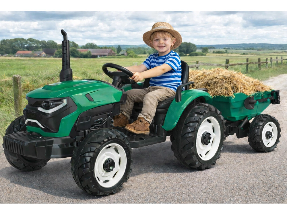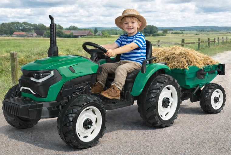 De elektrische tractor met afneembare aanhanger is een uitstekende keuze voor kleine boeren. De grote geprofileerde wielen kunnen zowel gras als verharde paden aan, de soepele start zonder schokken verhoogt het comfort en de veiligheidsriem houdt het kind stevig in het zadel. Het bedieningspaneel met lichten, claxon en USB zorgt voor extra sfeer.