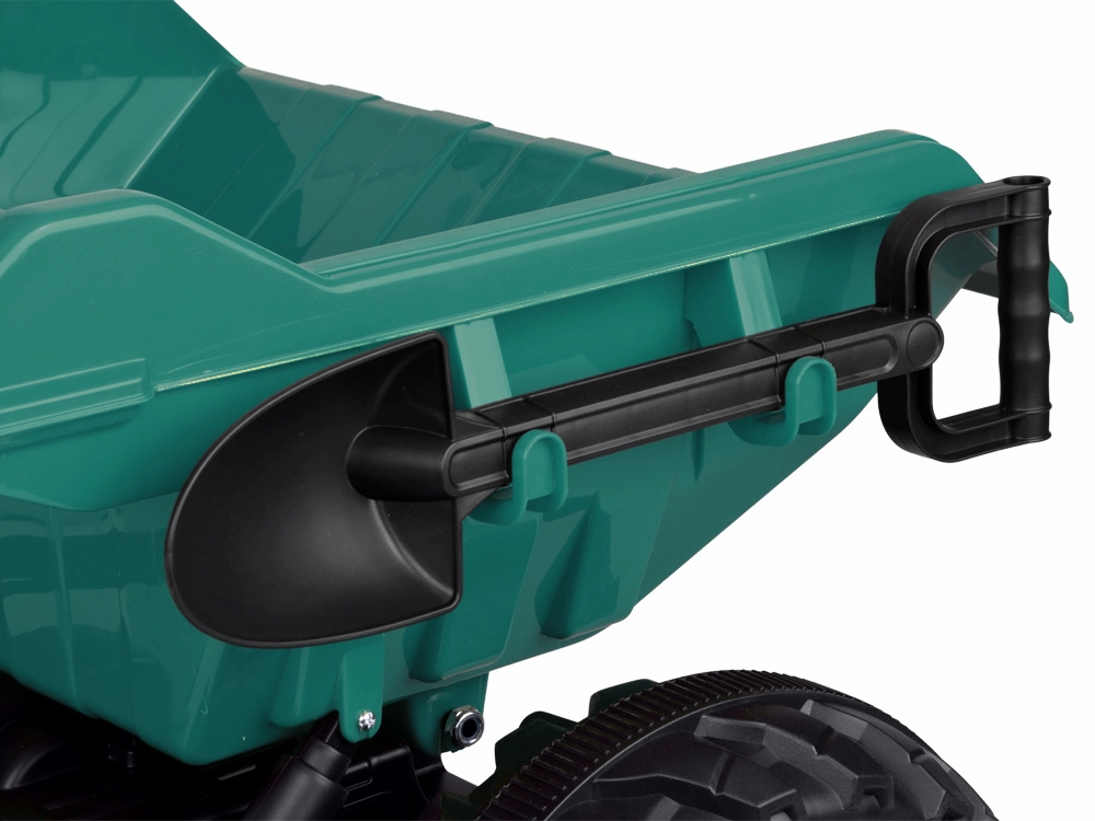 Het meeste plezier biedt de automatische kiepbak, die de lading met één druk kan lossen. De functie is eenvoudig uit te schakelen met een schakelaar onder de motorkap – zo kan de ouder de tractor aanpassen aan de leeftijd en vaardigheden van het kind. In de verpakking zit ook een afneembare schep voor het laden van zand, bladeren of speelgoed.