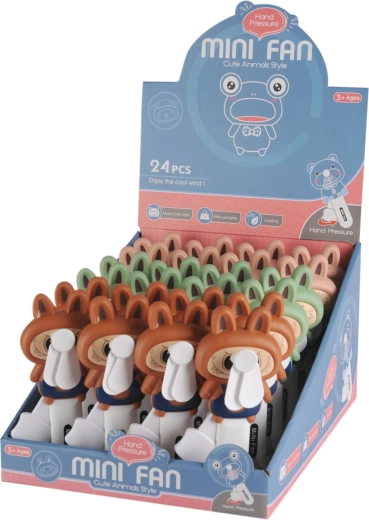 Leuke plastic handventilator in de vorm van een konijn die je laat draaien door de hendel in te knijpen. Eenvoudige verkoeling voor kinderen en volwassenen zonder batterijen, ideaal voor hete zomerdagen en onderweg dankzij de mechanische aandrijving met vliegwiel.