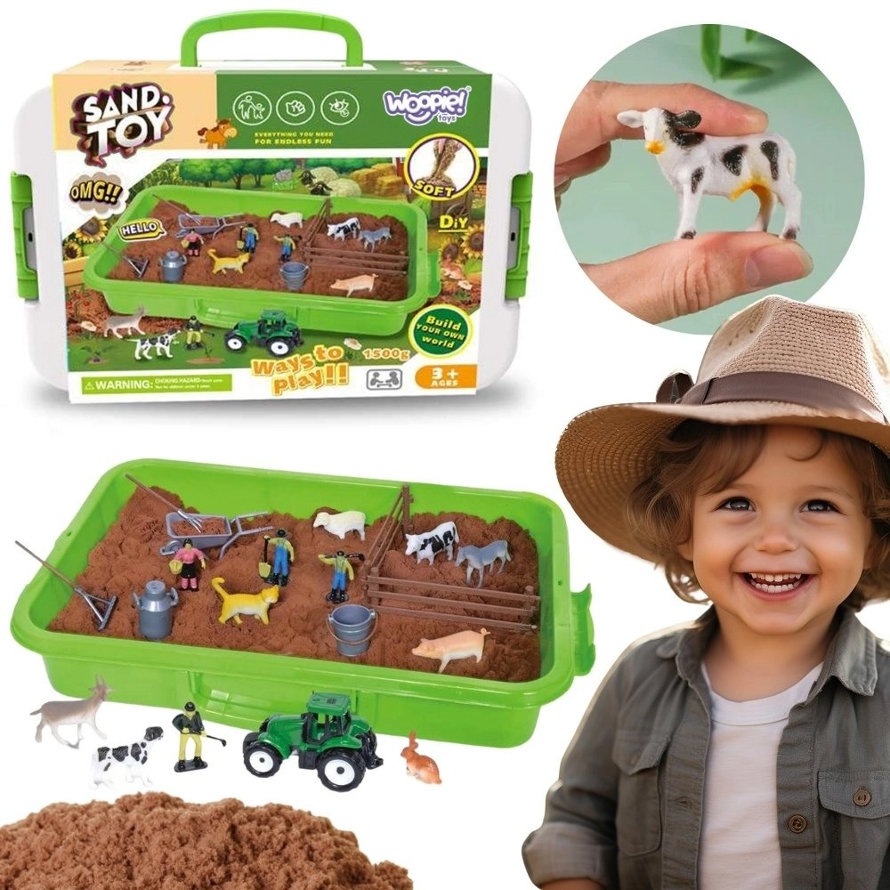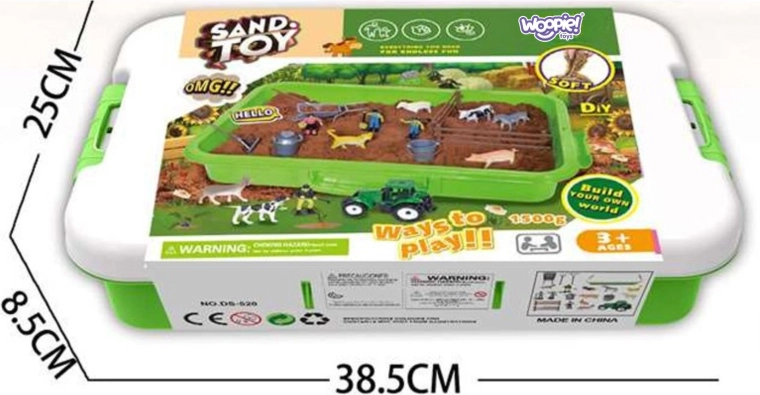 Maak je eigen boerderij en stimuleer de verbeelding van kinderen met de rijk uitgeruste Woopie-set. Kinetisch zand voelt prettig aan, plakt niet, houdt gemakkelijk vorm en droogt niet uit, ideaal voor urenlang speelplezier. De praktische groene koffer met handvat dient als draagbare zandbak en opbergbox – na het spelen ruim je alles eenvoudig op.