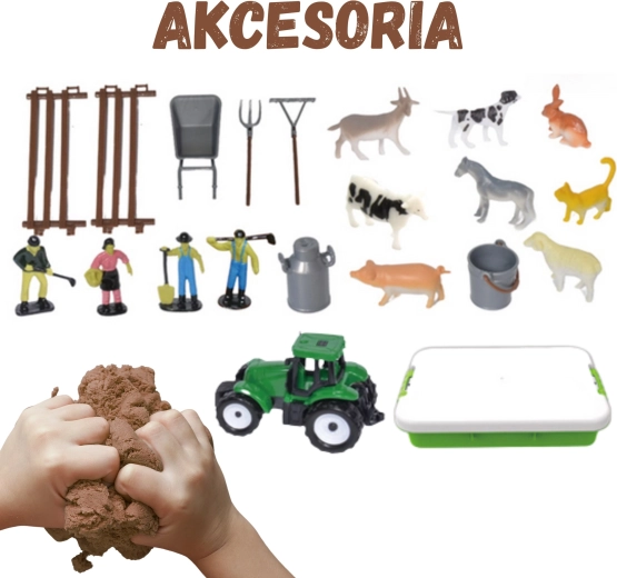 - Koffer/bak, kinetisch zand 1500 g, groene tractor, 4 boer-figuurtjes, dierenfiguren (paard, koe, schaap, biggetje, geit, hond, kat, konijn), 2 delen omheining, kruiwagen, vork, hark, gieter/melkbus, emmer, 6 zip-zakjes