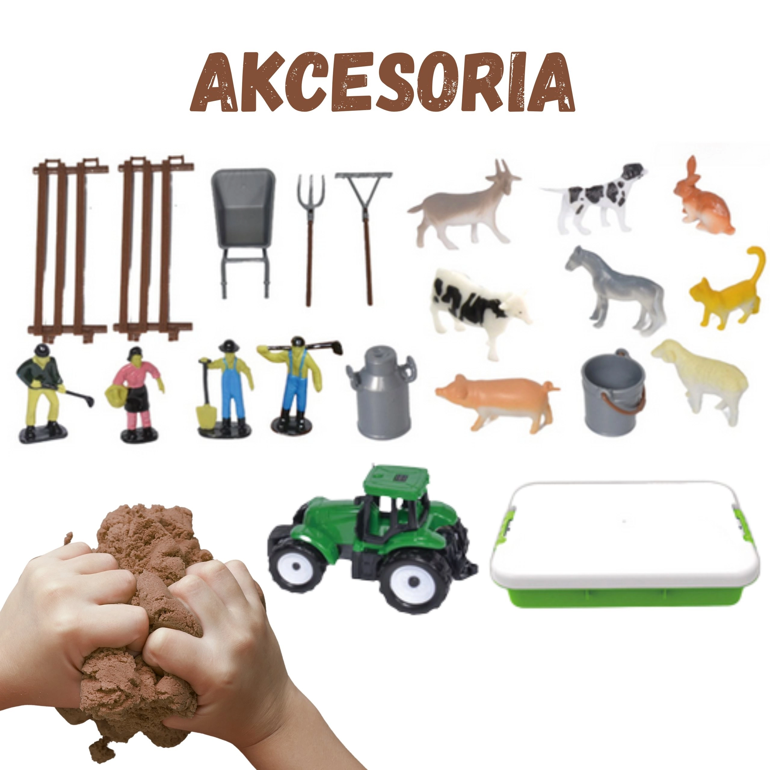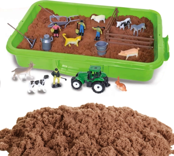 Ontdek de leuke wereld van de boerderij met deze creatieve set kinetisch zand. In het praktische koffertje vind je maar liefst 1500 g zacht, vormbaar zand in bruine kleur, een groene tractor, figuurtjes van boeren en boerderijdieren. Het koffertje dient tegelijk als speelbak, die alles netjes houdt en schone, sensorische en creatieve spel mogelijk maakt, thuis en onderweg.