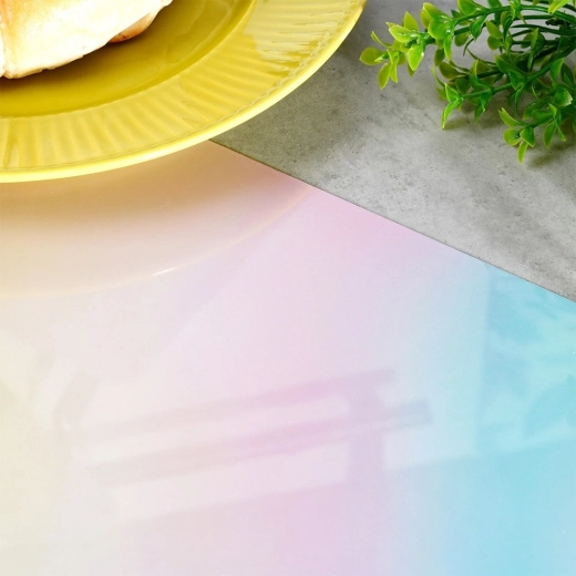 Breng zachte kleur en orde op tafel. Deze placemat met pastelverloop geeft je eettafel een decoratieve basis en beschermt het tafelblad effectief tegen warmte, vocht en vuil. Dankzij het formaat van 43,5 × 28,5 cm past hij perfect onder borden, schalen en dienbladen.