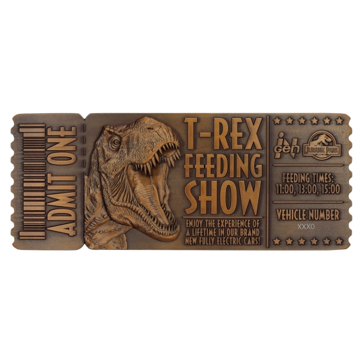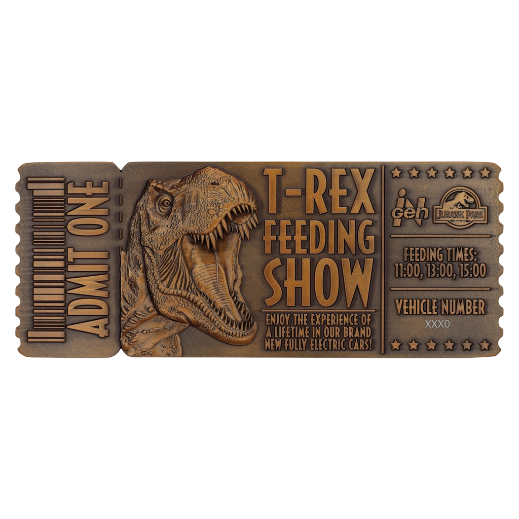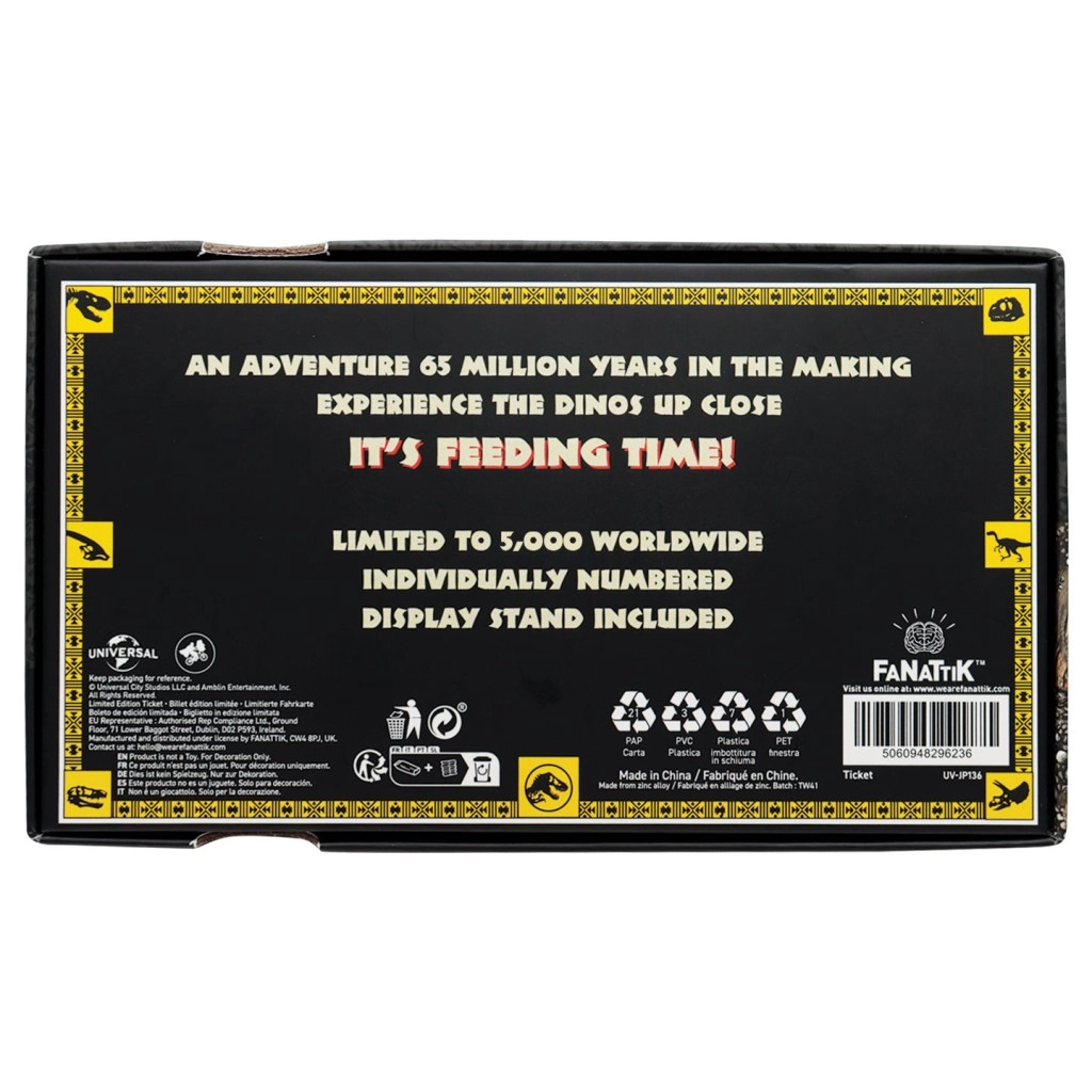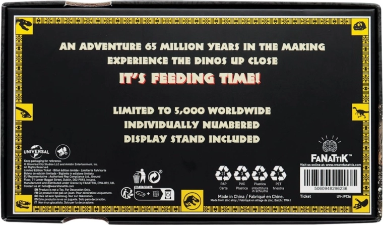 Decoratieve details, zoals gestileerde datum en locatie van het evenement, geven het toegangsbewijs de geloofwaardigheid van een filmische pass. Dankzij de compacte afmetingen berg je het gemakkelijk op in een portemonnee, doosje of op een plank. Het is een perfect cadeau voor liefhebbers van de dinosaurlogie, een geweldige aanvulling op andere gelicentieerde items en een opvallend stuk voor in de collectie.