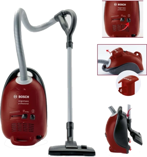 Realistische kinderstofzuiger met BOSCH-licentie van het merk Klein biedt kinderen leuk en veilig schoonmaakspeelgoed. Hij heeft een rode uitvoering met zwarte details, geluidseffecten zoals een echte stofzuiger en een werkende opzuigfunctie voor granulaat in een transparant reservoir. Dankzij de wieltjes, comfortabele handgreep en het lichte ontwerp is hij makkelijk te bedienen en stimuleert hij rollenspel en de fijne motoriek.