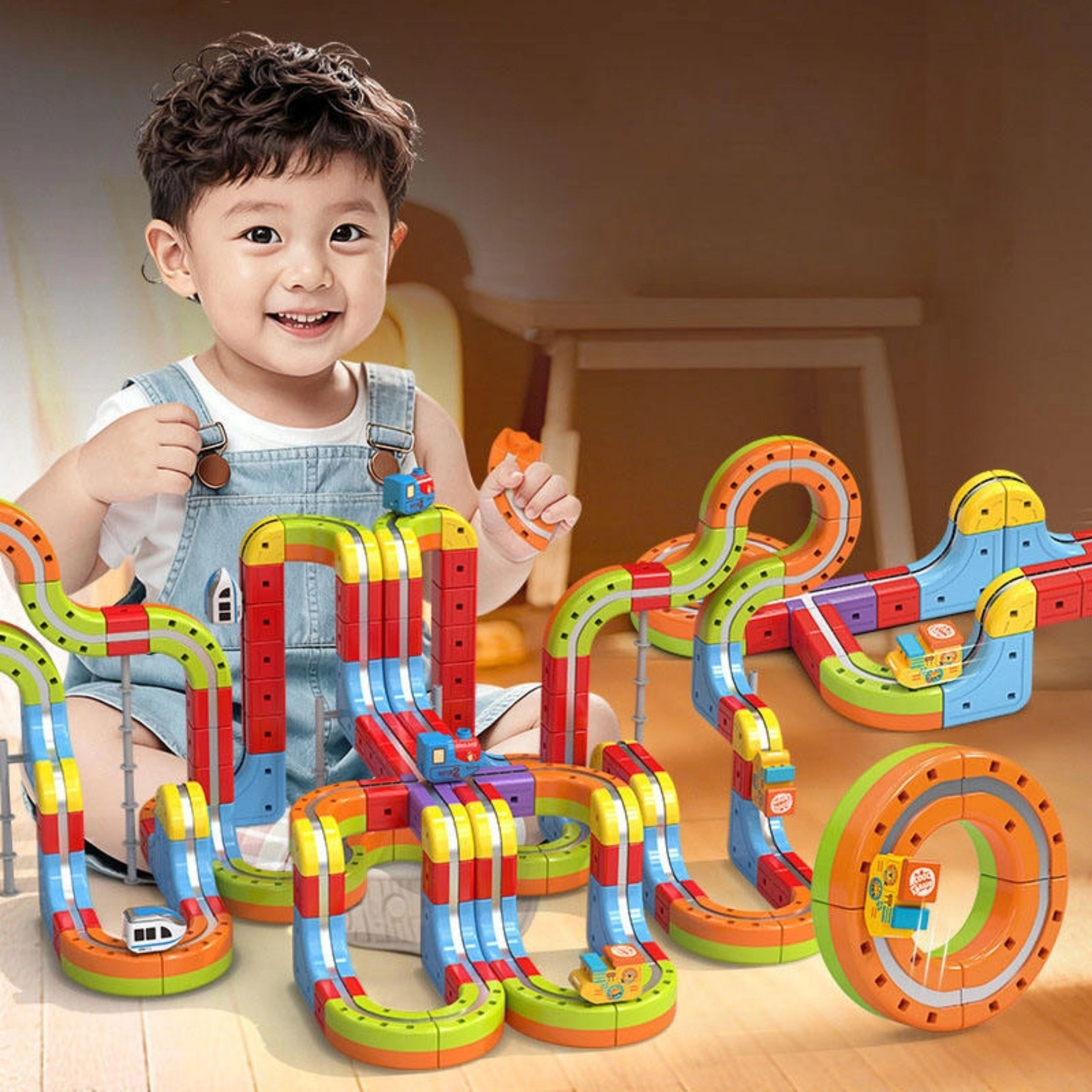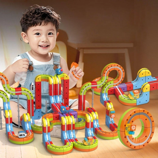 Een leuke én leerzame bouwset die de verbeelding en het logisch denken van kinderen prikkelt. Modulaire, meerkleurige onderdelen laten je gevarieerde banen ontwerpen met bruggen, hellingen en bochten. Magnetische adhesie houdt het wagentje stabiel op de rails, zodat het soepel door uitdagende secties rijdt.