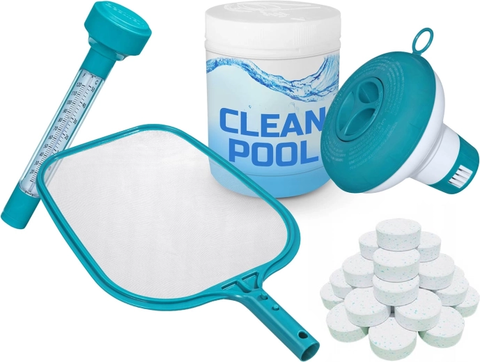 Een filterpomp met filter type II, doseerder met multitabletten, schepnet en thermometer houden het water kristalhelder met een minimum aan werk.