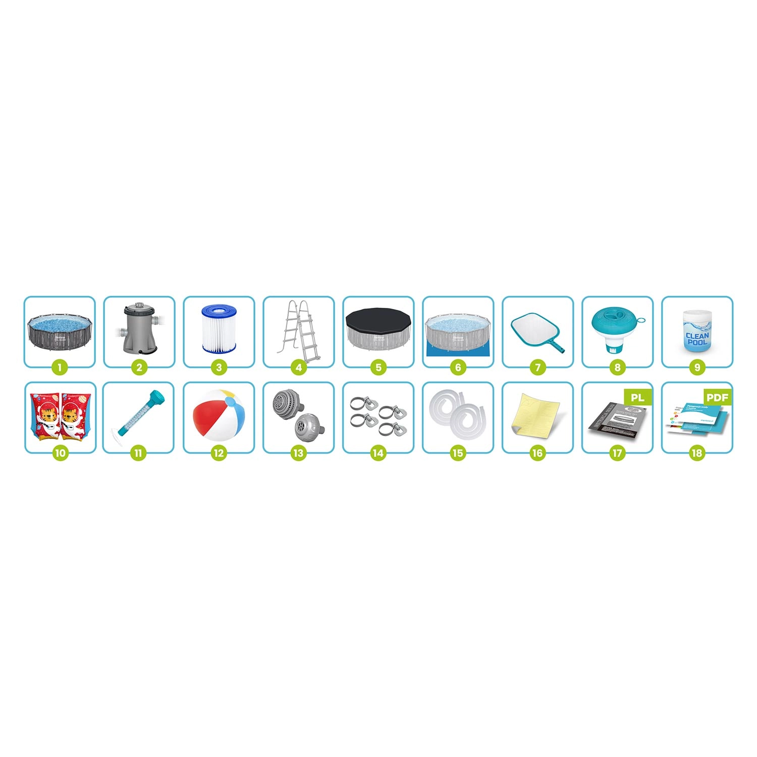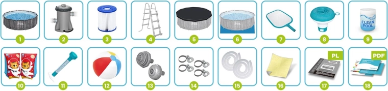 De 18-in-1 set bevat een complete uitrusting voor eenvoudige installatie en zorgeloos onderhoud: een krachtige filterpomp met filter type II, afdekzeil tegen vuil, onderlegzeil ter bescherming van de bodem, een veiligheidsladder met afneembare treden, multitabletten met doseerder, thermometer, schepnet, slangen en klemmen, zeef voor de pomp en een reparatiepatch. Ook een kleurrijke strandbal voor het hele gezin ontbreekt niet.