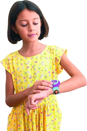 De horloge heeft een speels paars–mintgroen design met personageprints op de band, is licht, comfortabel en eenvoudig te bedienen, ook door jongere kinderen. Dankzij de verstelbare band past hij om verschillende polsmaten en met de meegeleverde batterijen werkt hij direct na het uitpakken.