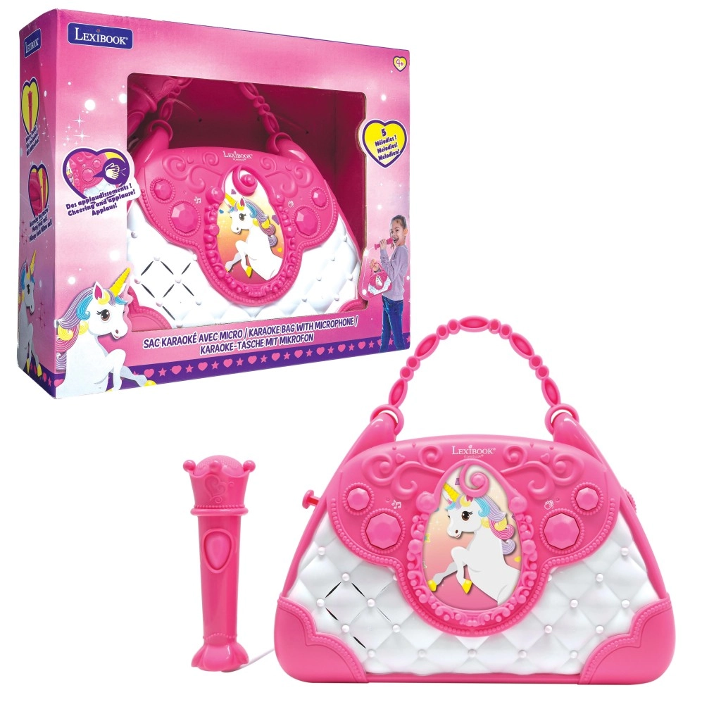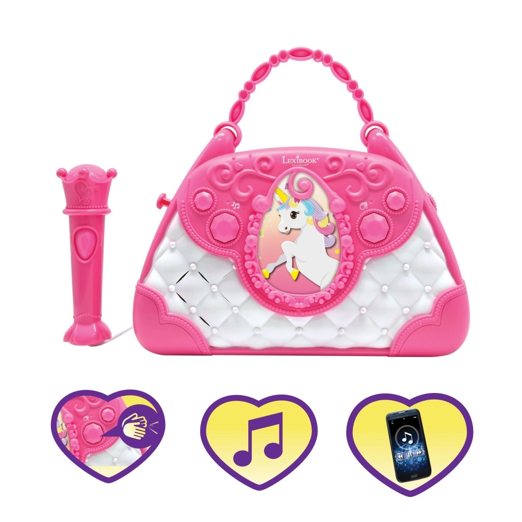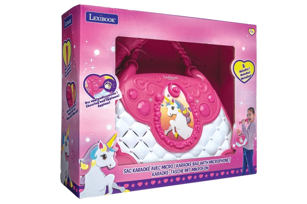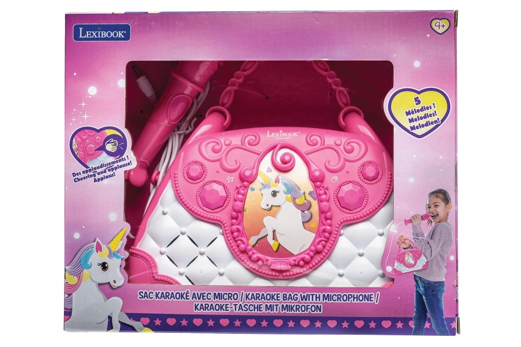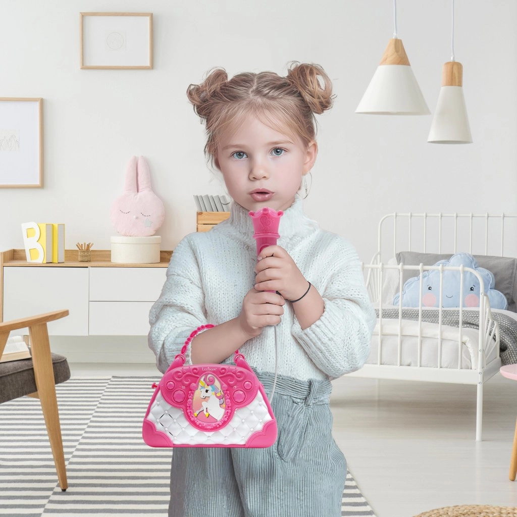De stijlvolle roze-witte handtas met Eenhoorn-motief maakt van elke dag een klein podium. Kinderen kunnen in de microfoon zingen en hun stem horen via de krachtige ingebouwde luidspreker. Met de intuïtieve knoppen stel je gemakkelijk de volume in, kies je melodieën en activeer je het applaus dat hun zelfvertrouwen vergroot.