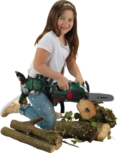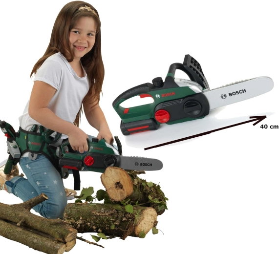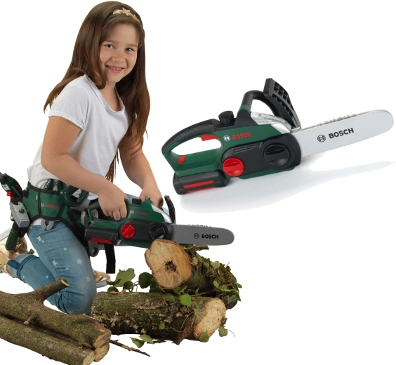 Realistische kinderkettingzaag op batterijen van het merk Klein onder de licentie BOSCH mini voor kleine doe-het-zelvers. Biedt een bewegende “ketting”, lichteffecten, geluid van een draaiende zaag en een ergonomische handgreep voor comfortabel en veilig spelen.
