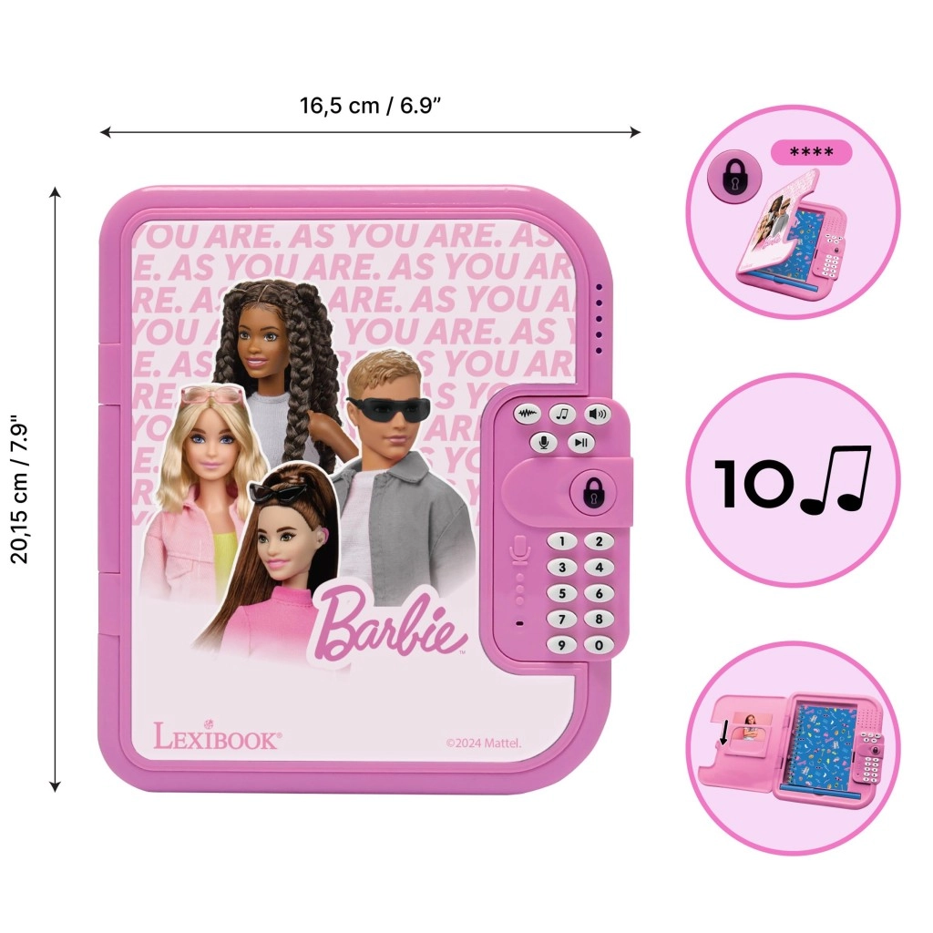 Bewaar je geheimen veilig met het elektronische BARBIE-dagboek van Lexibook. Dankzij de viercijferige code, spraakopname en magische geluidseffecten is het opschrijven van belevenissen leuk, creatief en privé. Compact roze design met BARBIE-motieven, een handig notitieboek en pen in de verpakking – ideaal voor kinderen vanaf 6 jaar.