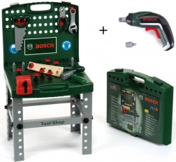 Draagbare BOSCH-werkplaats in koffer met accu-schroevendraaier Ixolino II. Biedt een uitgebreide set accessoires, een opvouwbaar ontwerp en functies zoals rechts-/linksom draaien, licht en geluid met verwisselbare bits.