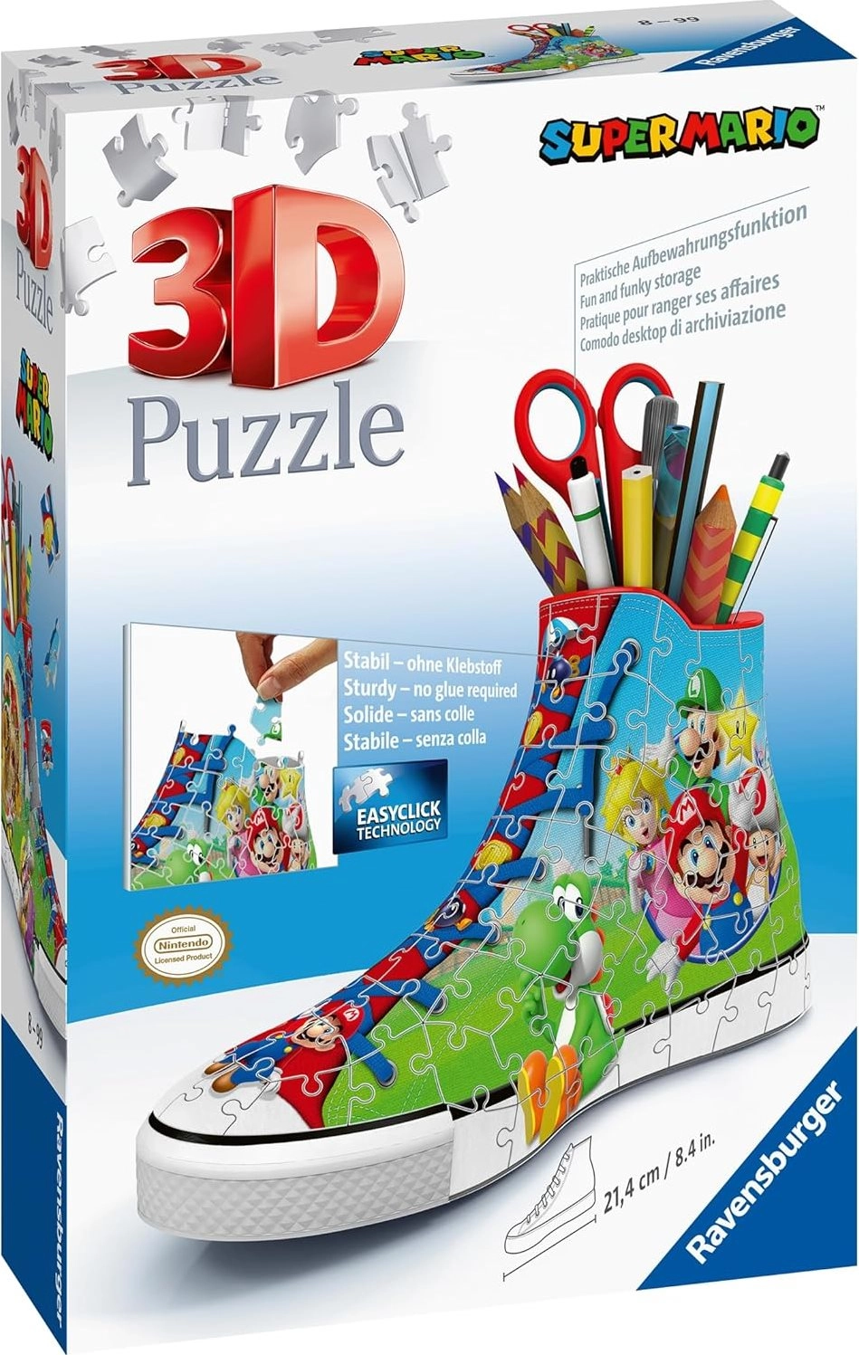 Maak van 108 kunststof puzzelstukjes deze klassieke sneaker met Super Mario-motief en creëer de perfecte kamerdecoratie! Na het in elkaar zetten wacht je nog een bonus: je kunt hem gebruiken voor kwasten, potloden, enz.