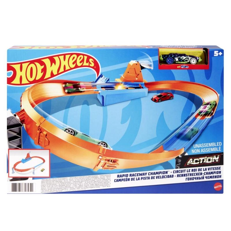 Met de set Rivaliteit van Kampioenen van HOT WHEELS genieten kinderen van races, drifts en stunts op oranje banen met launchers en bochten. Inclusief startpoort, krachtige lanceerder, omver te rijden vlaggetjes voor punten en 1 metalen autootje om meteen te starten.