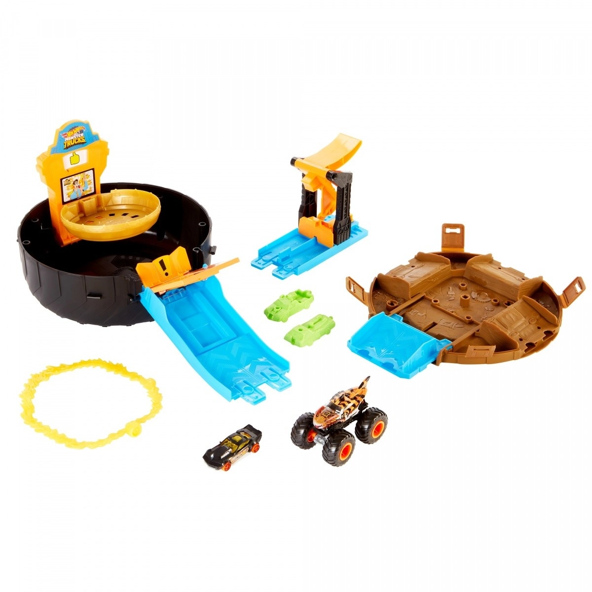 Draagbare stuntarena in de vorm van een reuzenband van Hot Wheels Monster Trucks brengt epische sprongen, crashes en wedstrijden overal naartoe. Uitgeklapt is de set ca. 89 cm lang en bevat een lanceerder voor 2 autootjes of 1 monstertruck, een vuurring, een scorebord en een winnaarsplatform. Inclusief Monster Truck Tiger Shark en Hot Wheels 1:64 autootje.