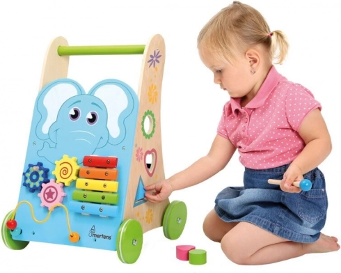 Ondersteun de eerste stapjes én de nieuwsgierige geest van je kind met dit hoogwaardige houten loopwagentje met olifant. Het biedt een xylofoon met zachte klank, een kralenlabyrint, een vormenstoof en tandwielen voor zowel plezier als de ontwikkeling van de motoriek. Stille rubberen wielen beschermen de vloer en de stabiele constructie van FSC-hout garandeert veilig spel vanaf 18 maanden.