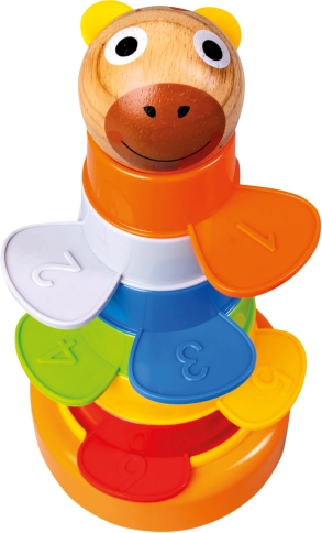 Deze vrolijke toren combineert spelen en leren in één. Zes kleurrijke bekertjes worden op een stabiele basis gestapeld en aangevuld met een houten balletje in de vorm van een berenkop. Kinderen kunnen de onderdelen niet alleen stapelen, maar ook in elkaar plaatsen, sorteren op grootte of kleur en kennismaken met de eerste cijfers.
